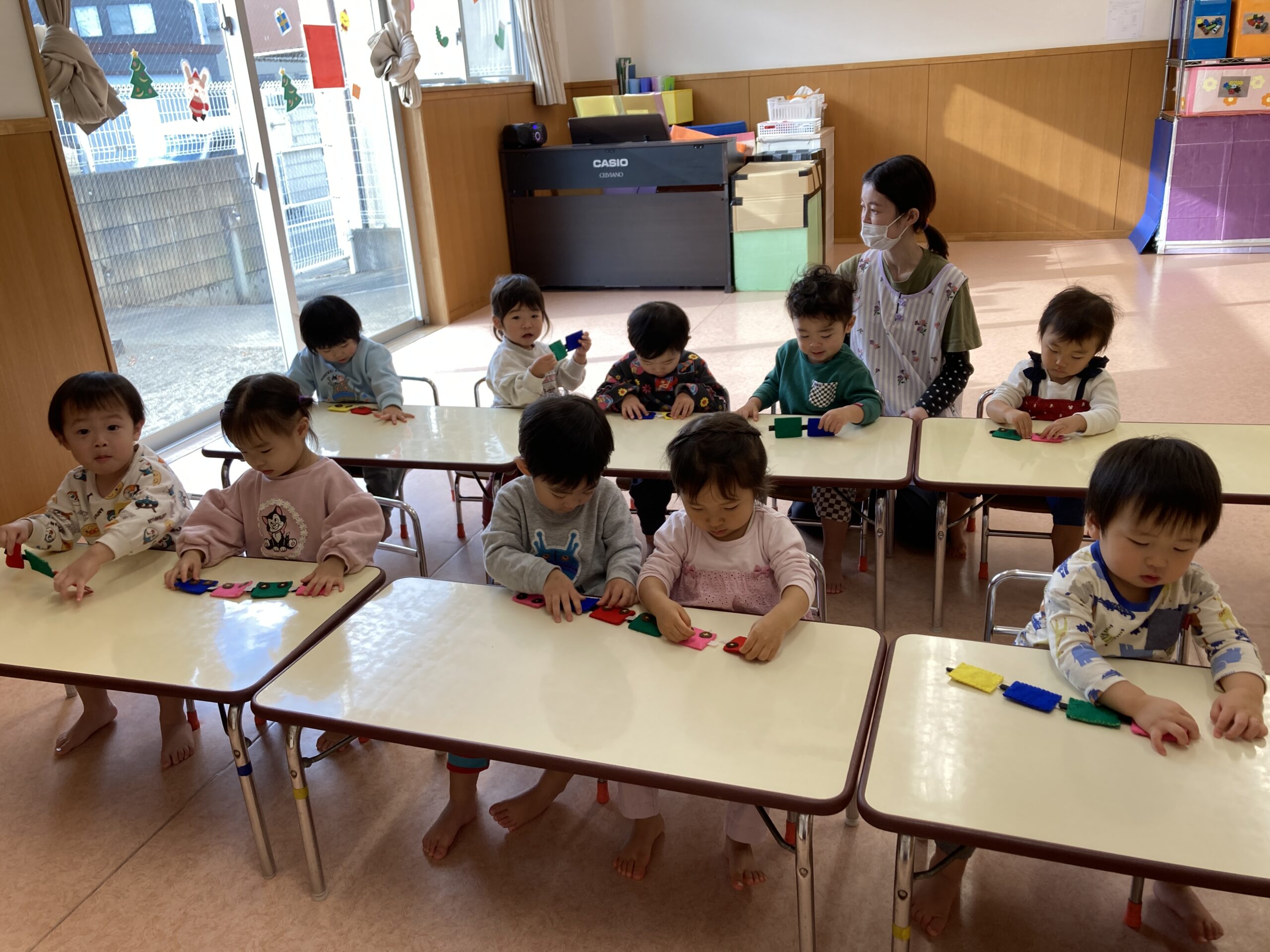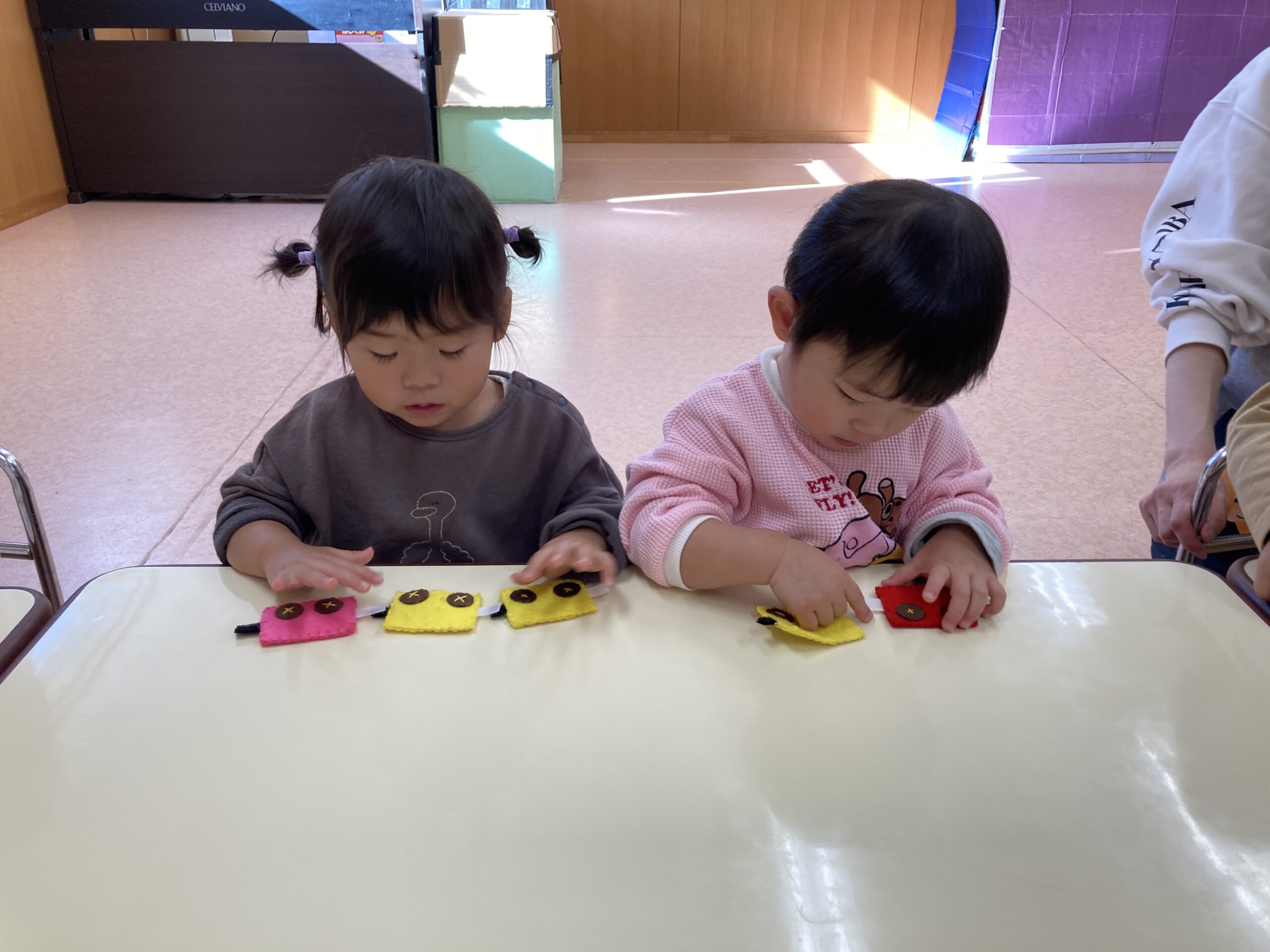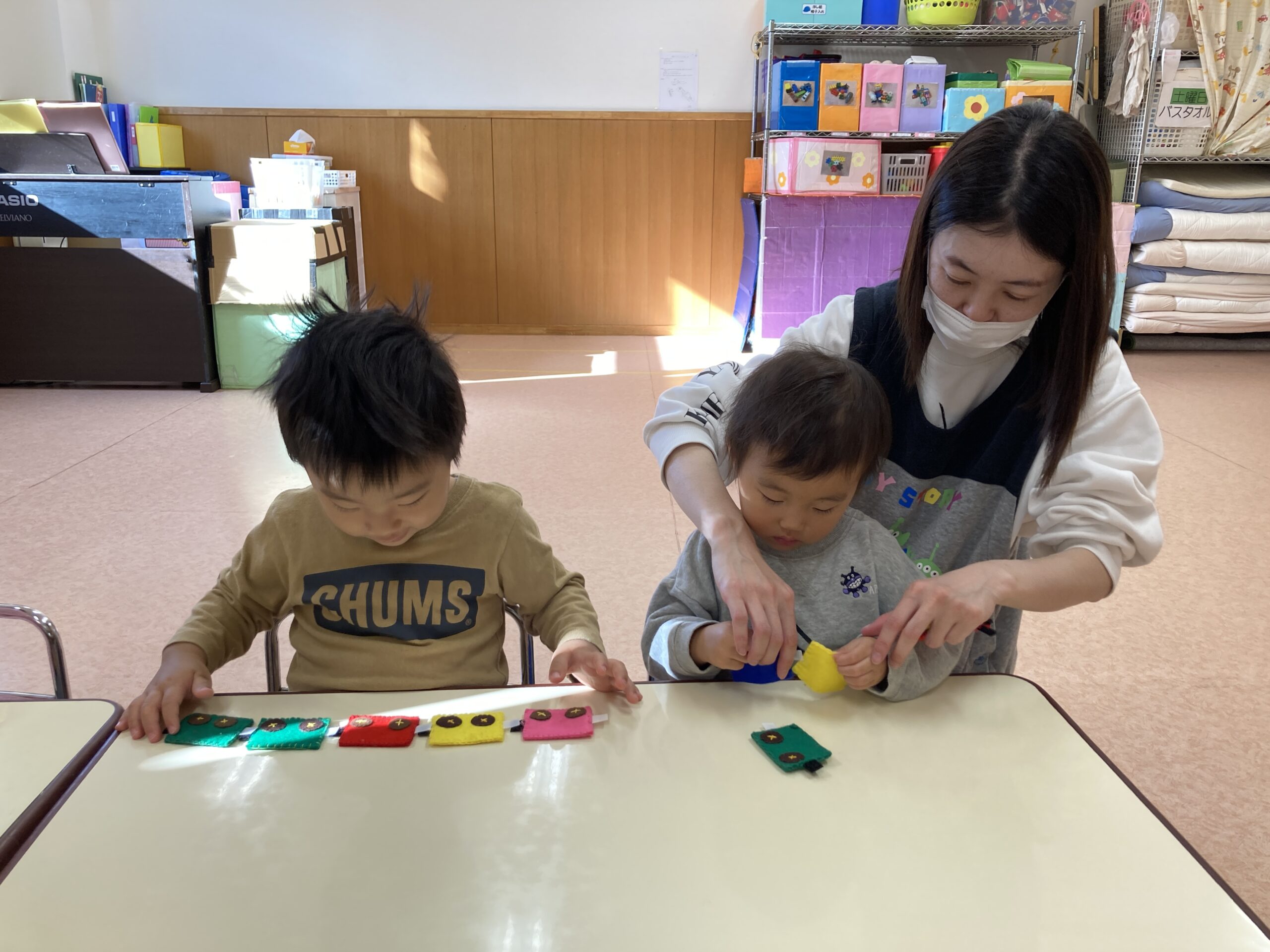 最近のほし組さんのお気に入りの指先遊びは、電車をマジックテープでくっつけて長くする遊びです。