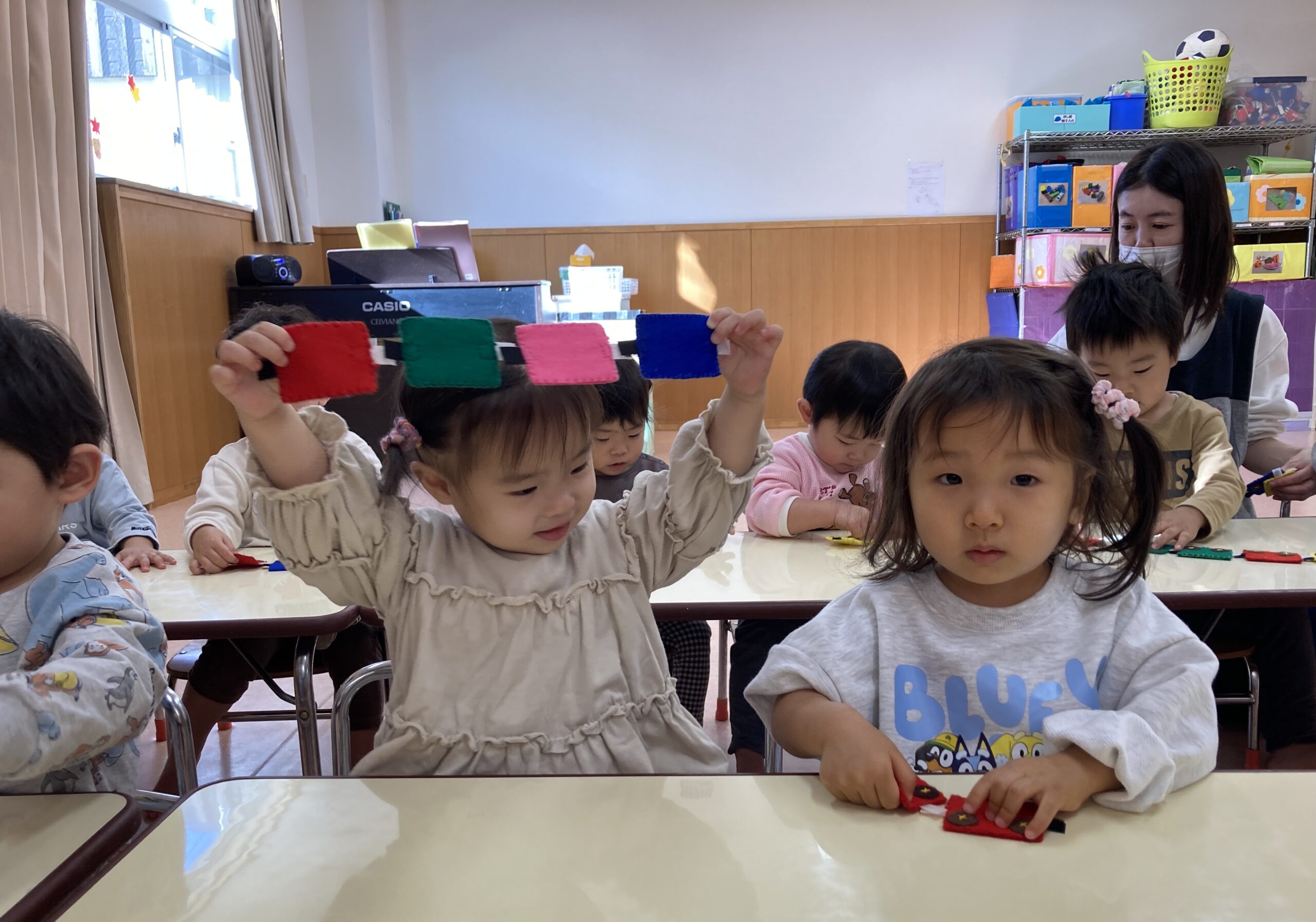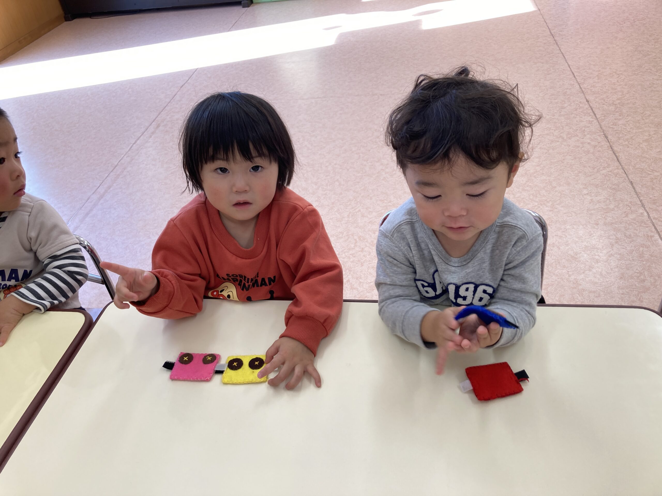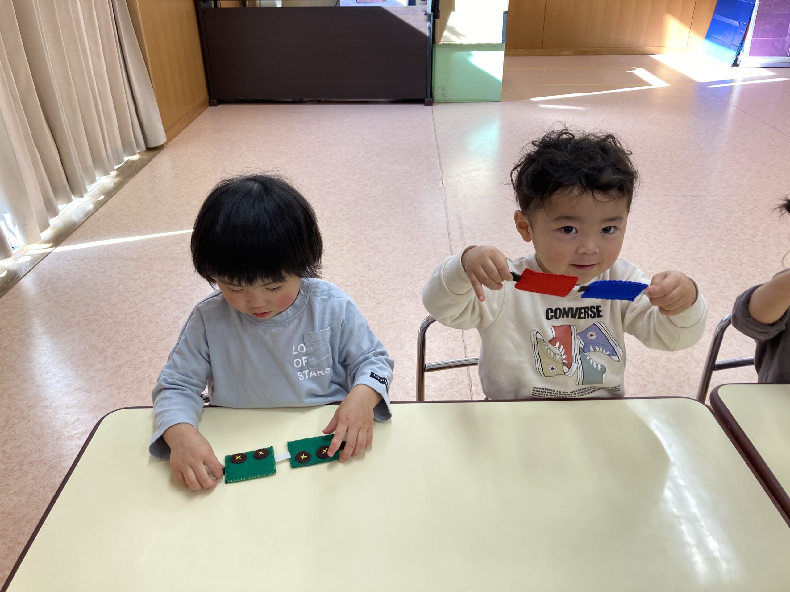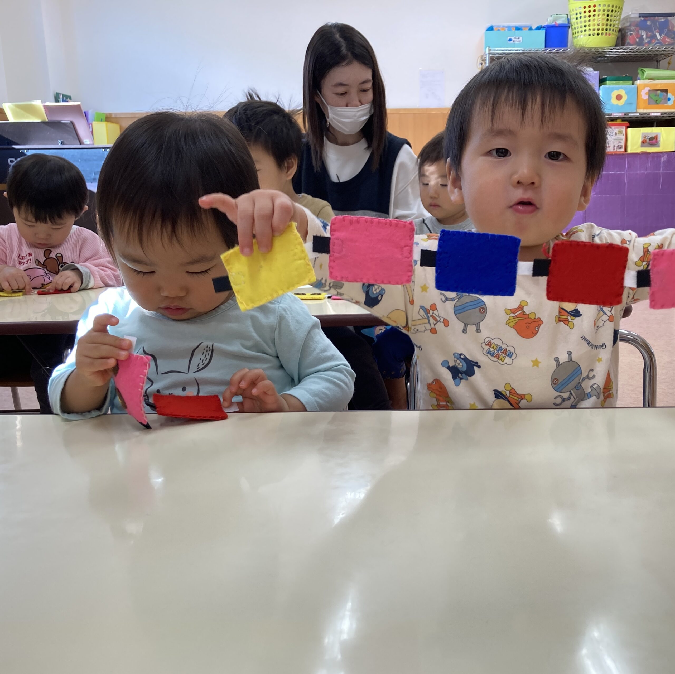 赤や青、緑や黄色、白や黒など色も楽しんだり指先を使いながらマジックテープをくっつける事を楽しんだり、長くなって嬉しくて見せてくれたりして遊んでいますよ。