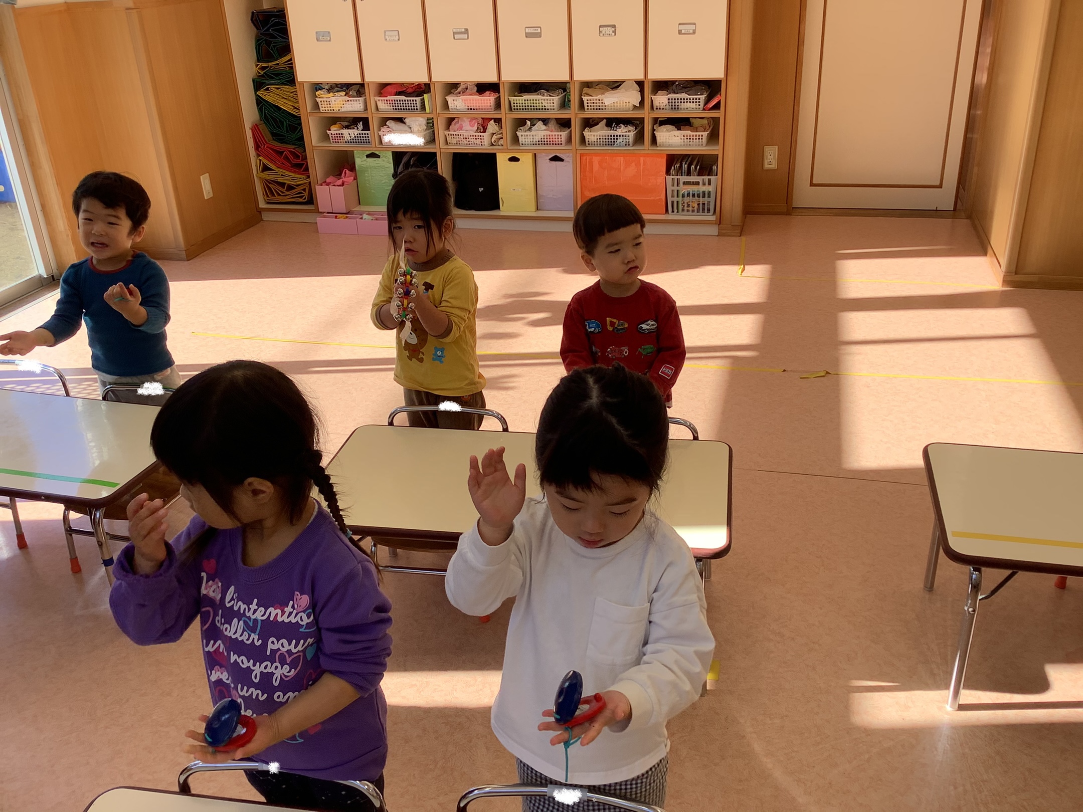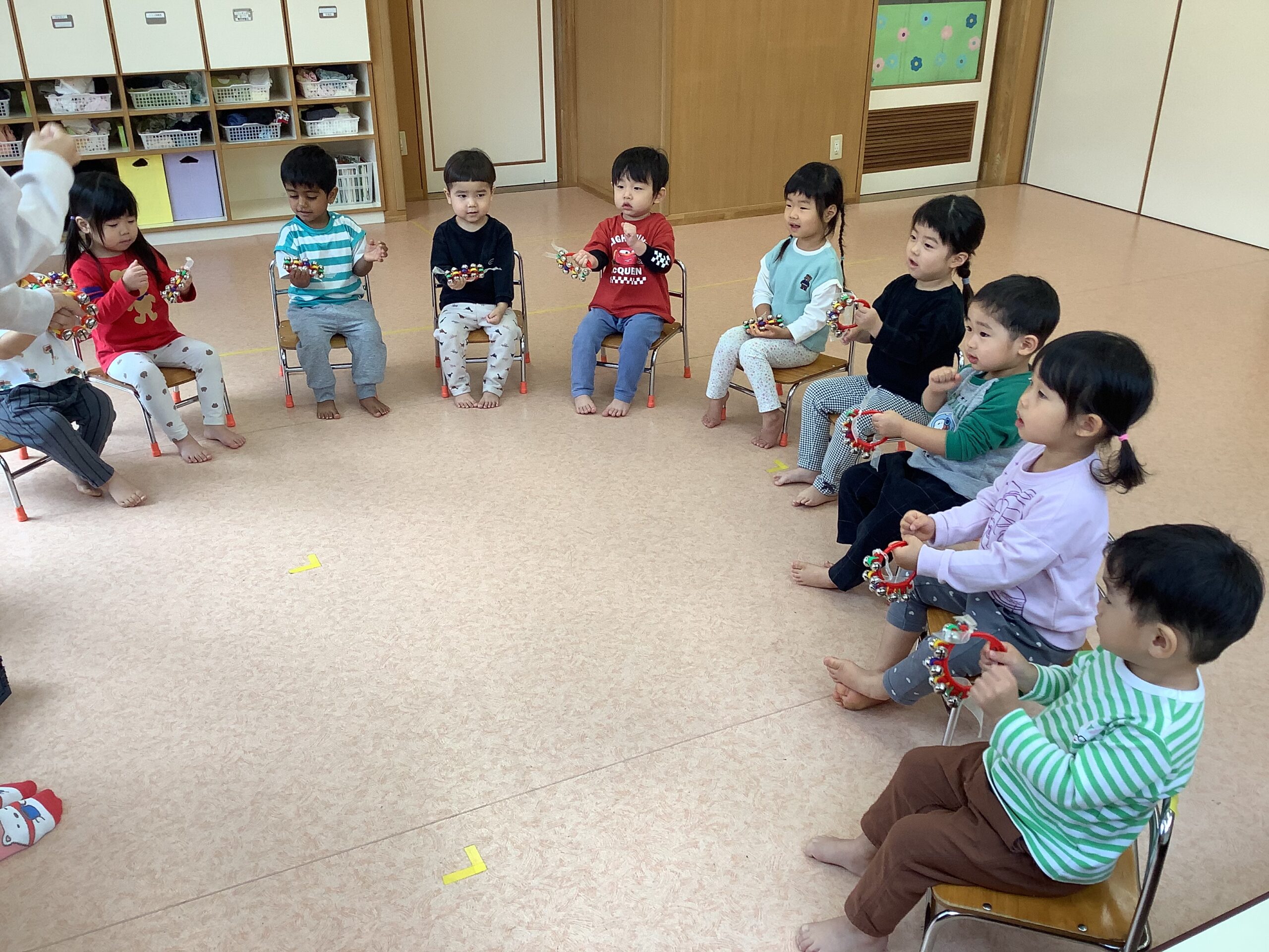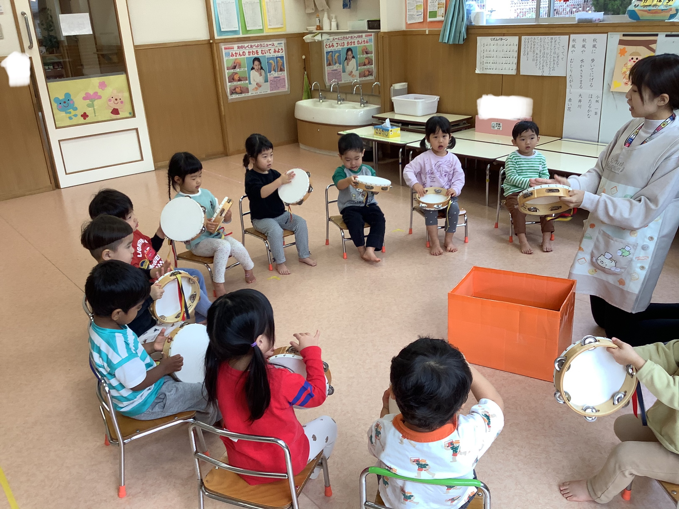 タンバリンは1番重たい楽器ですが、しっかり自分で持ってたたくことができていました。運動会の時に、タンバリンを使ったことを思い出して嬉しそうにしていたはな組です(^^)