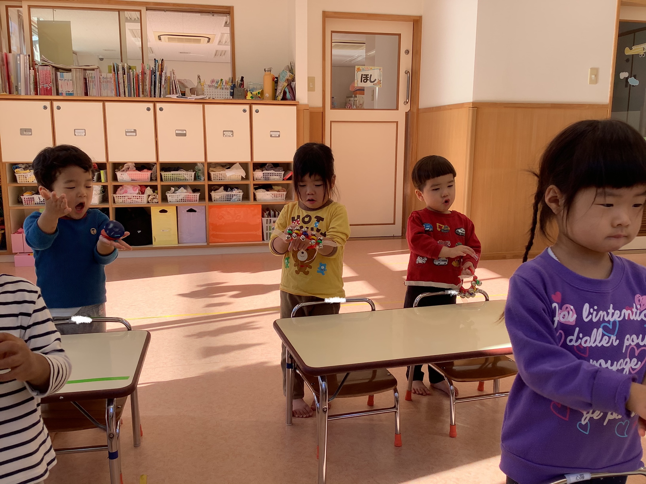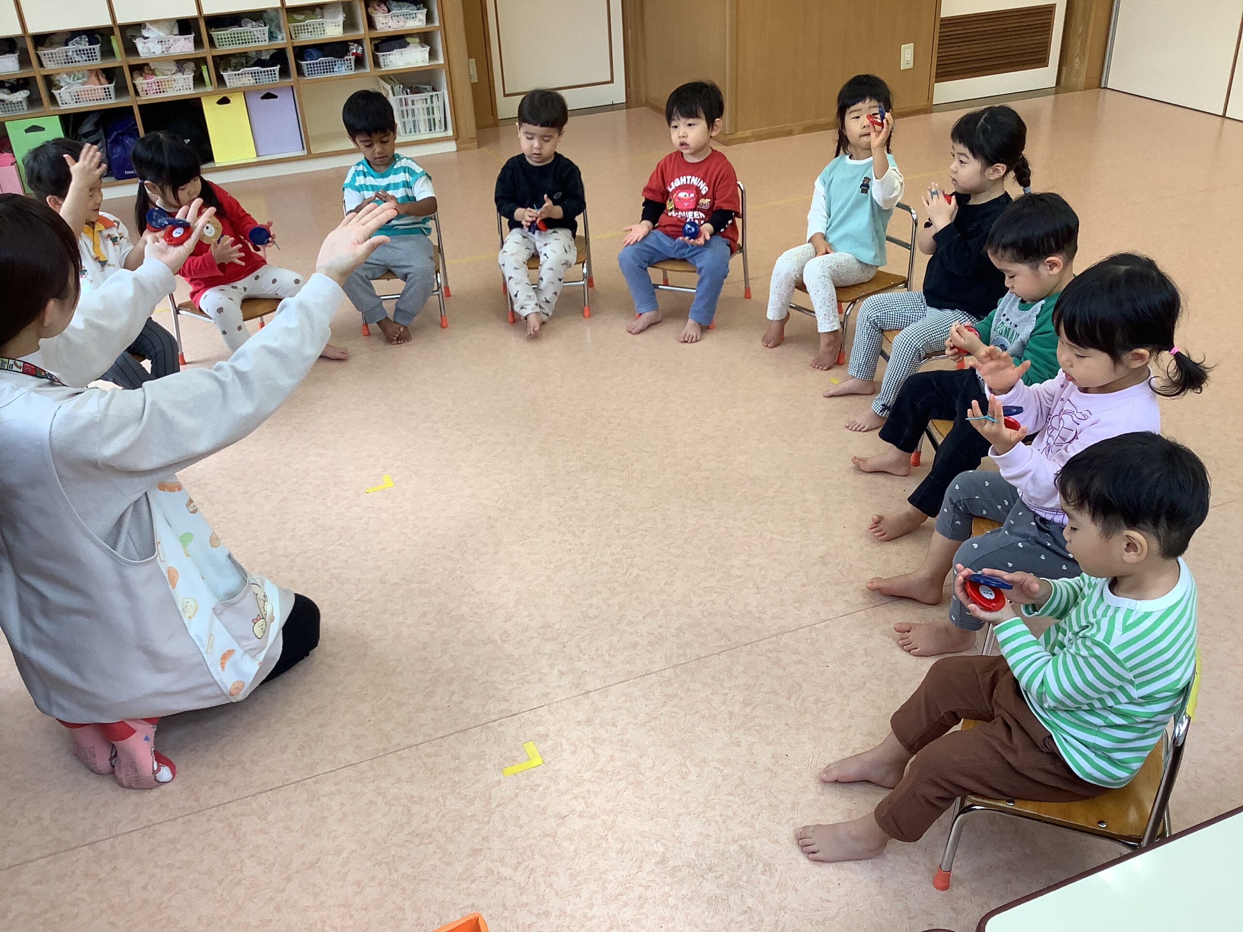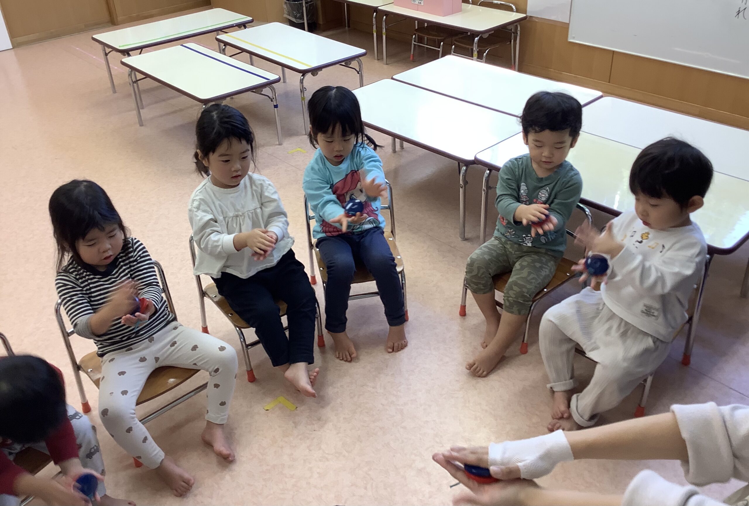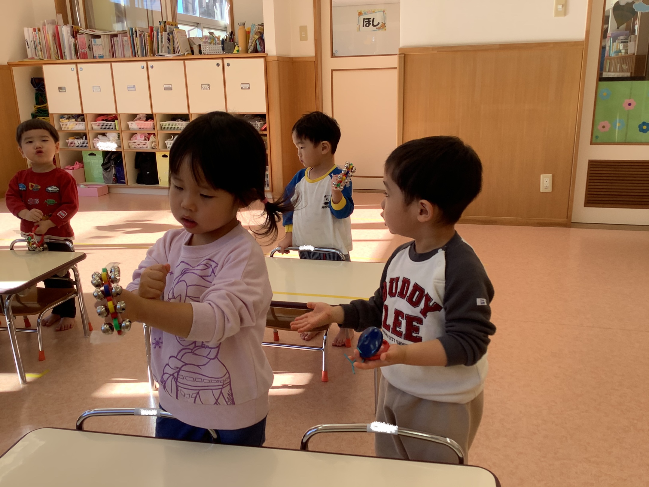 タンバリンは1番重たい楽器ですが、しっかり自分で持ってたたくことができていました。運動会の時に、タンバリンを使ったことを思い出して嬉しそうにしていたはな組です(^^)