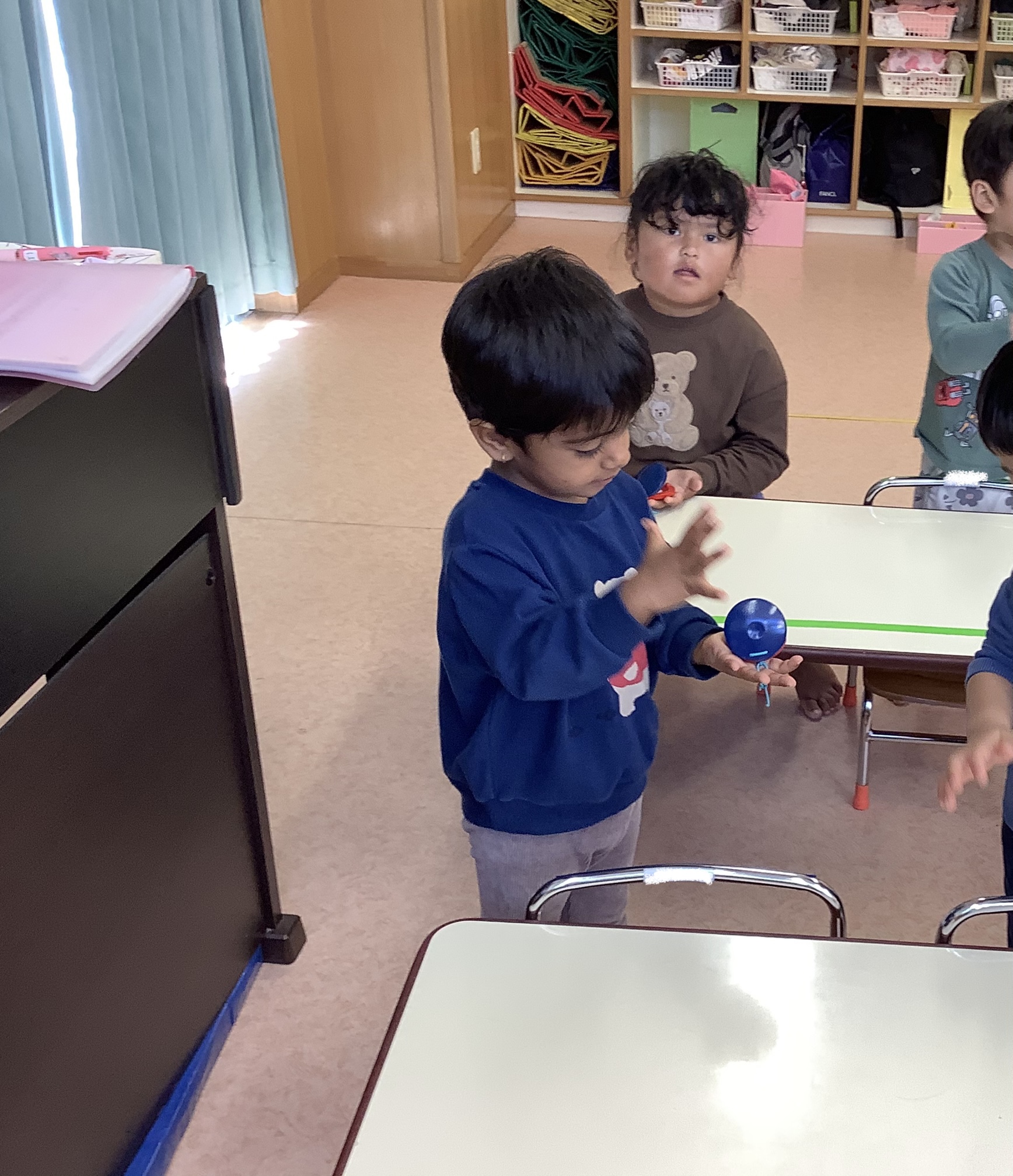 まずは鈴を行っている様子です。「シャンシャン♪」と大きな音が鳴るのを楽しんだり、一つ一つの鈴が動くのをじーっと見ている子もいますよ。