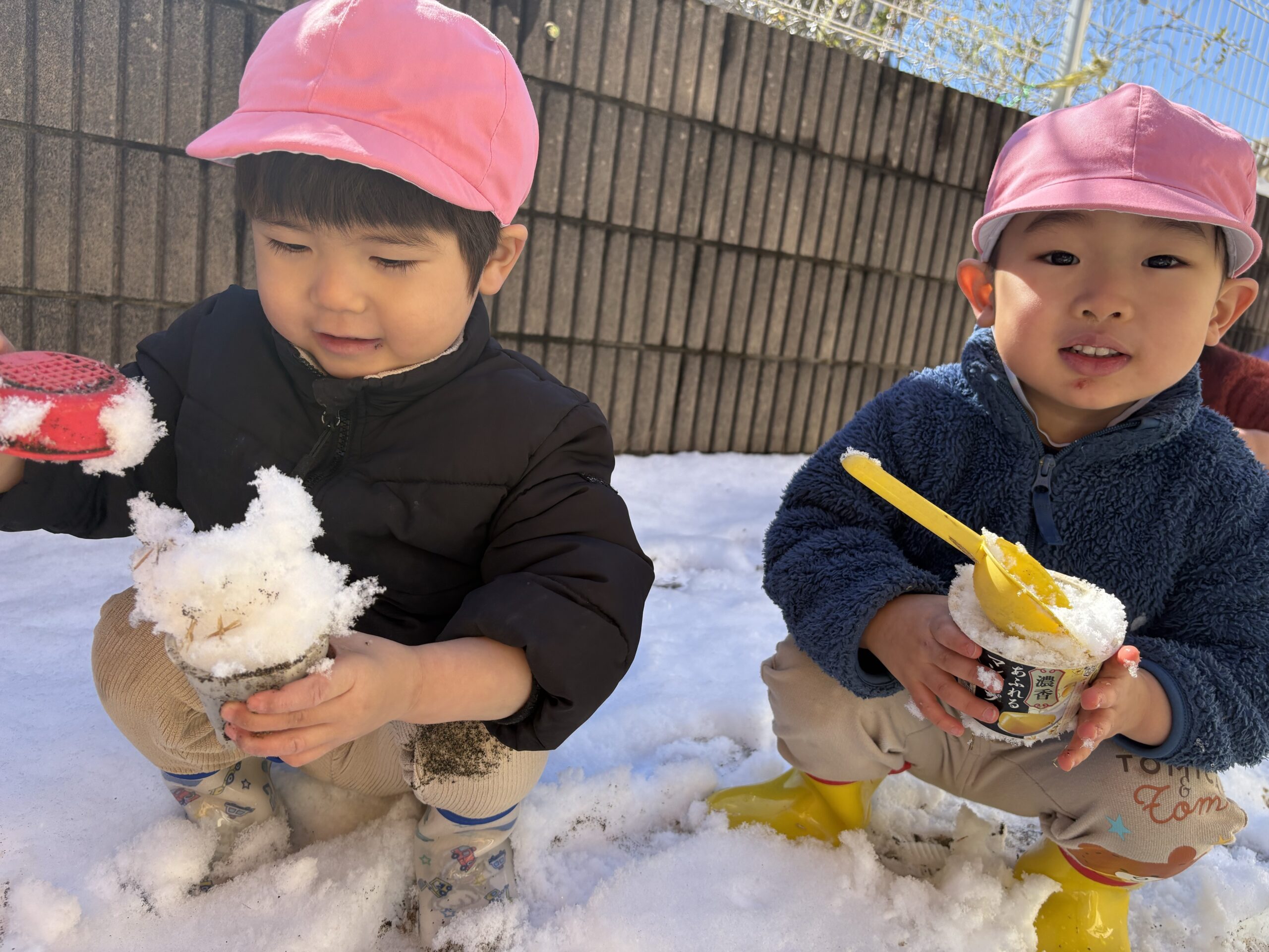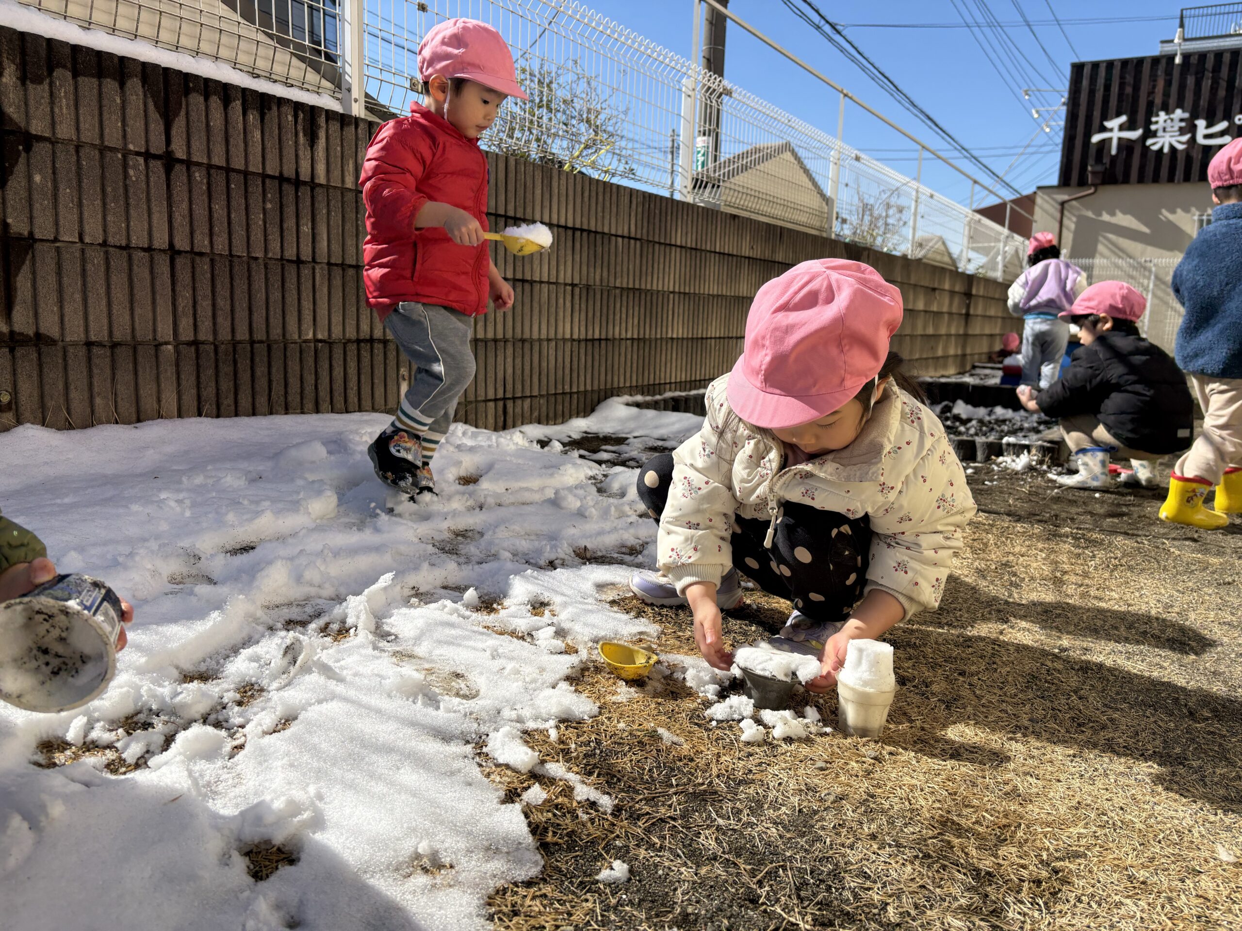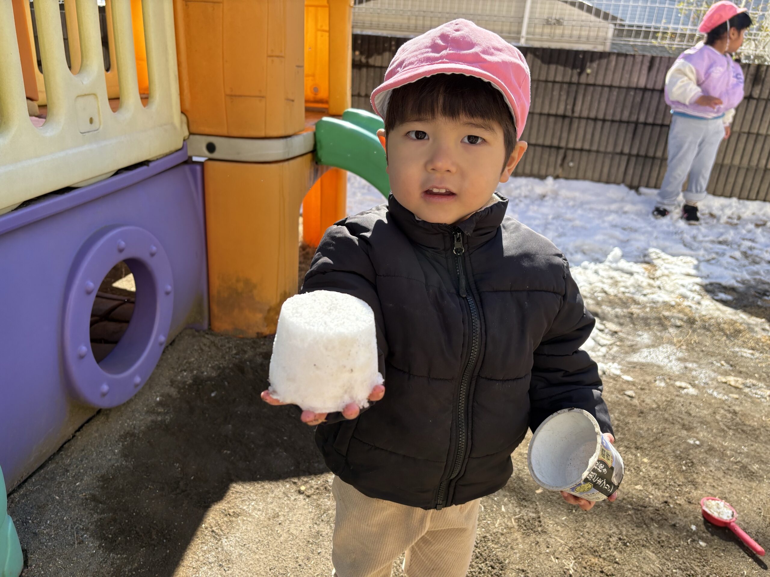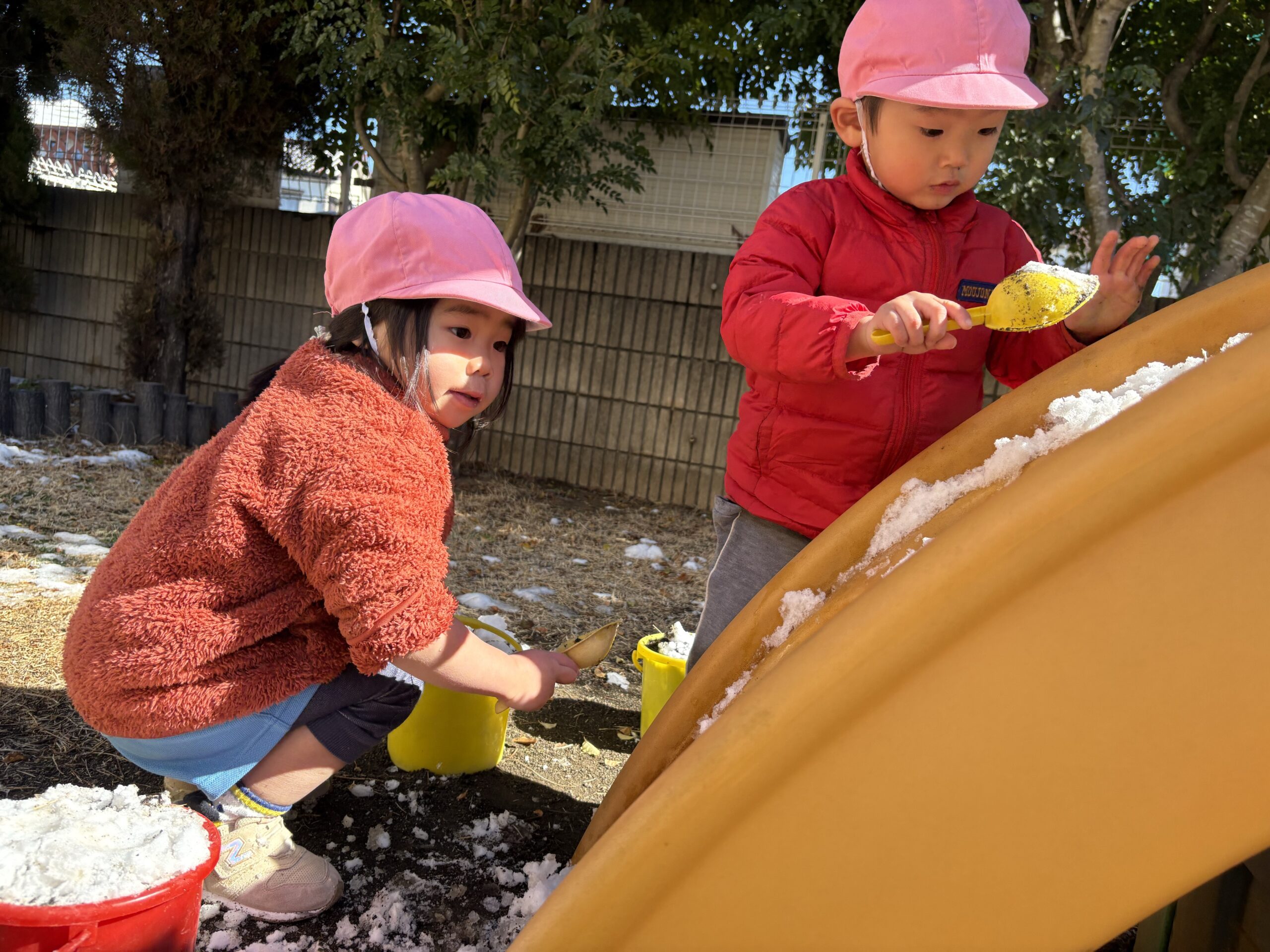 園庭に出ると「雪で何作ろっか〜」と玩具を持ってウキウキなはな組さん♬