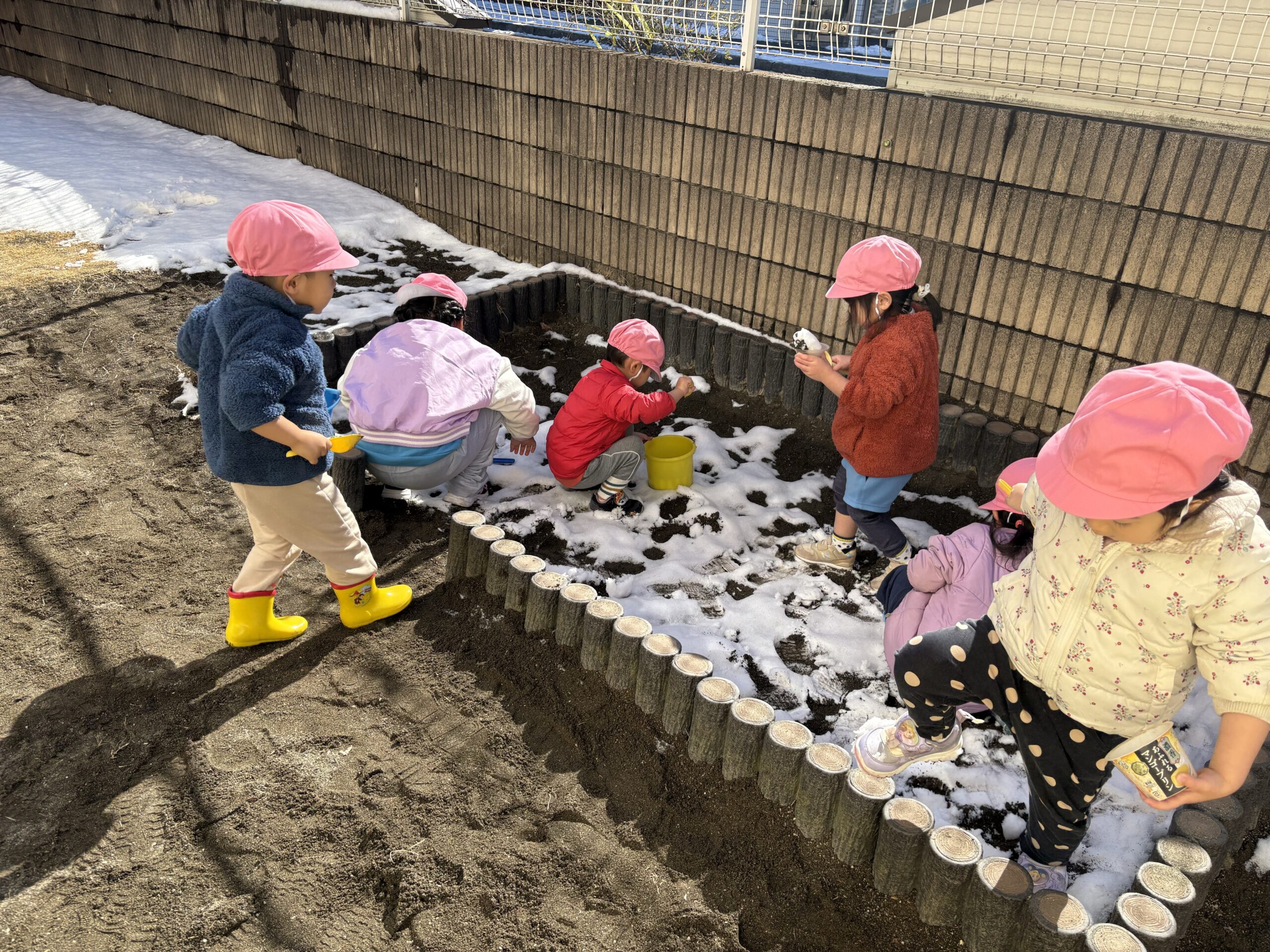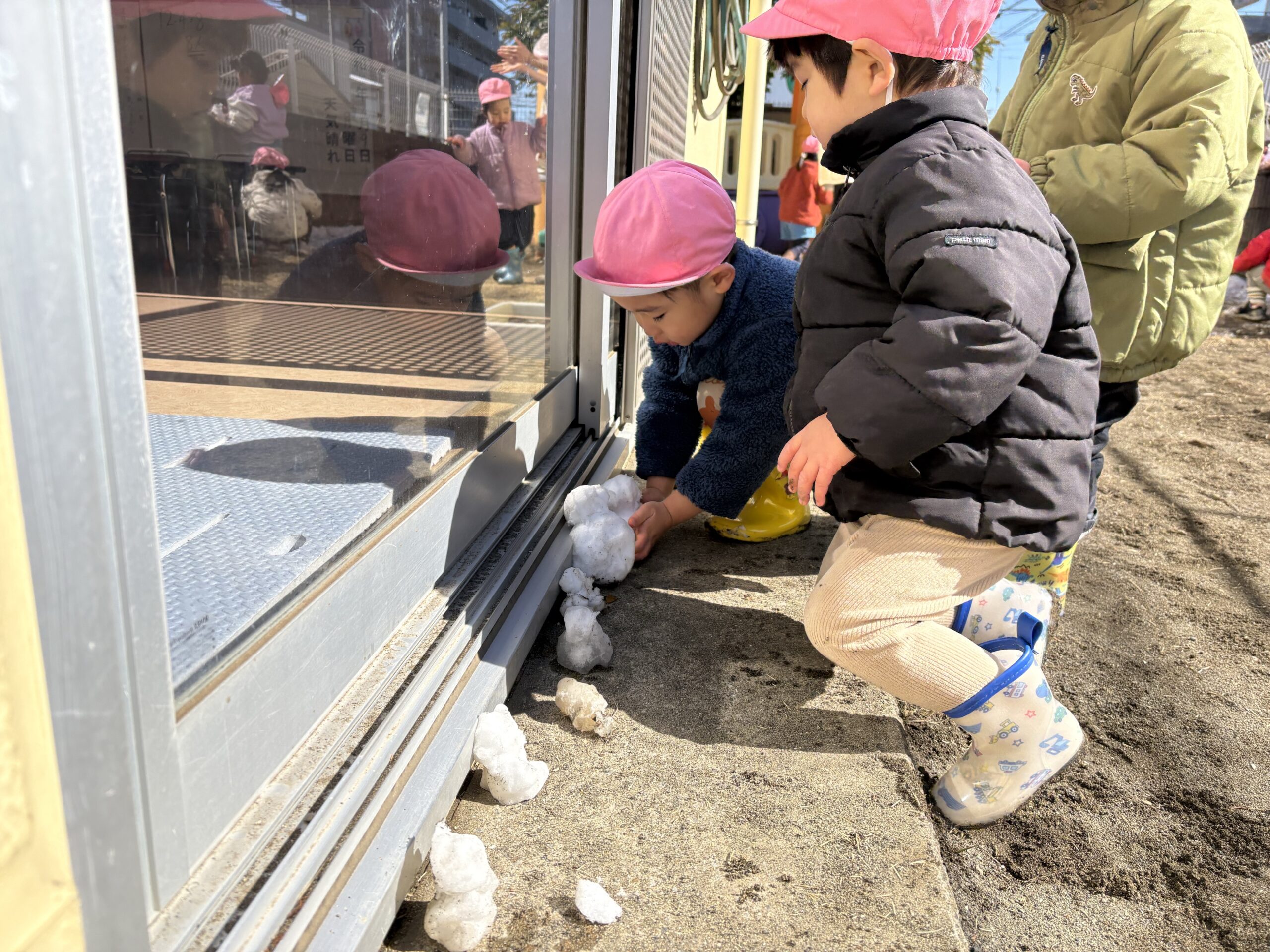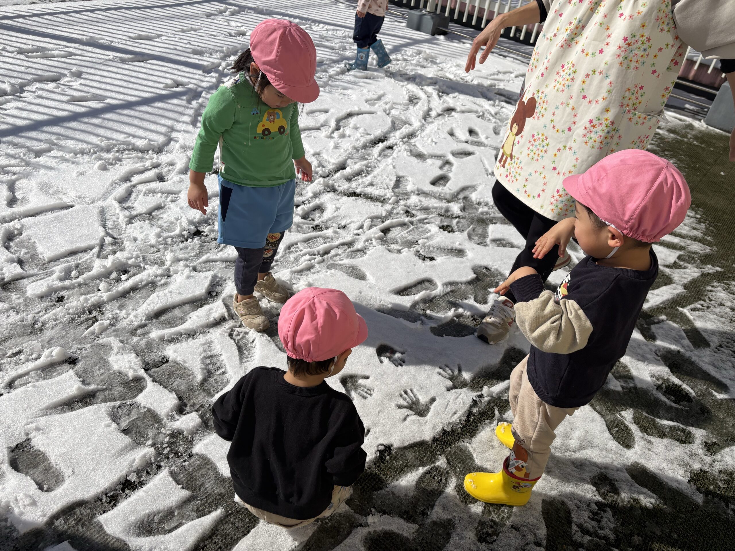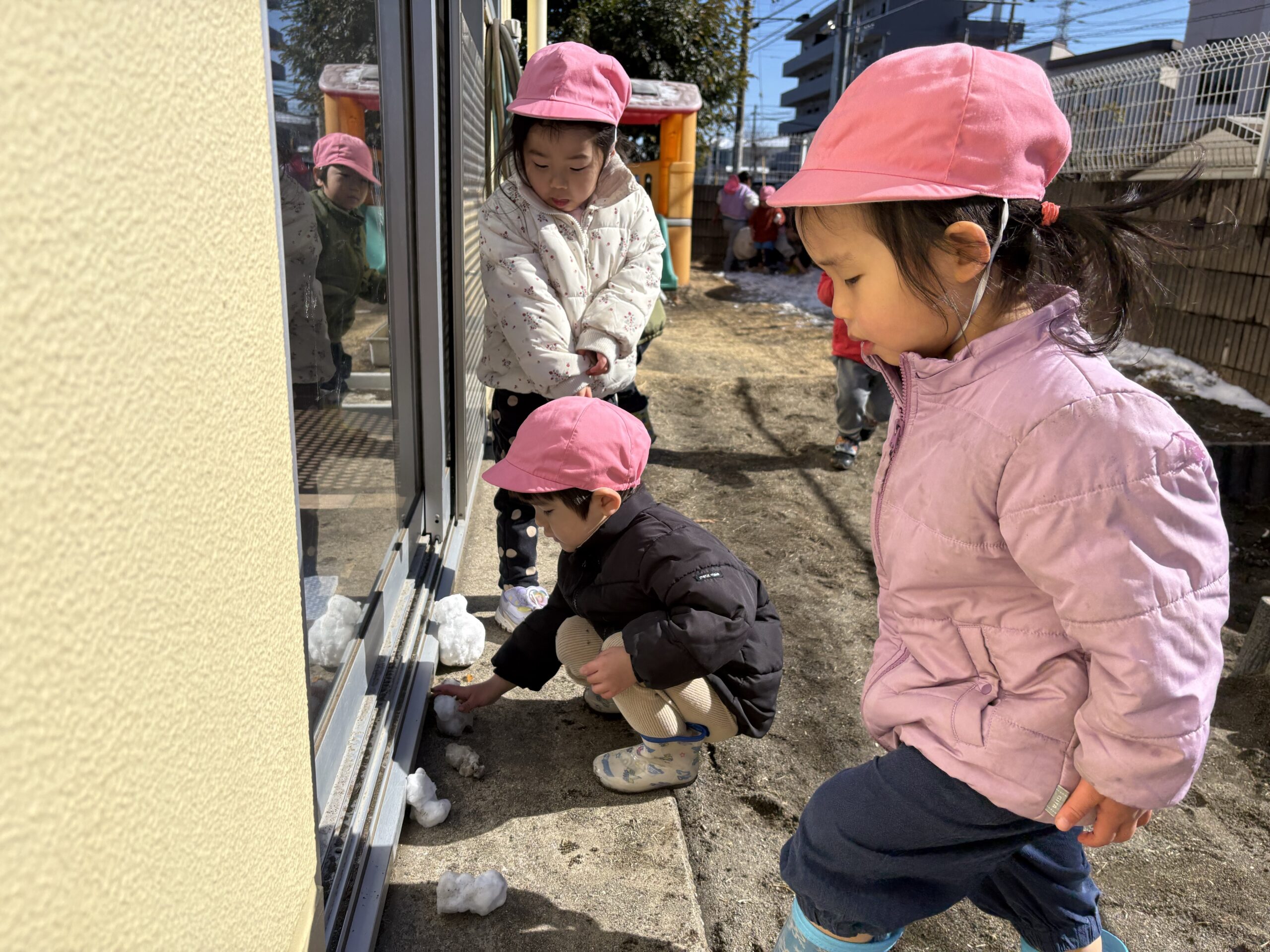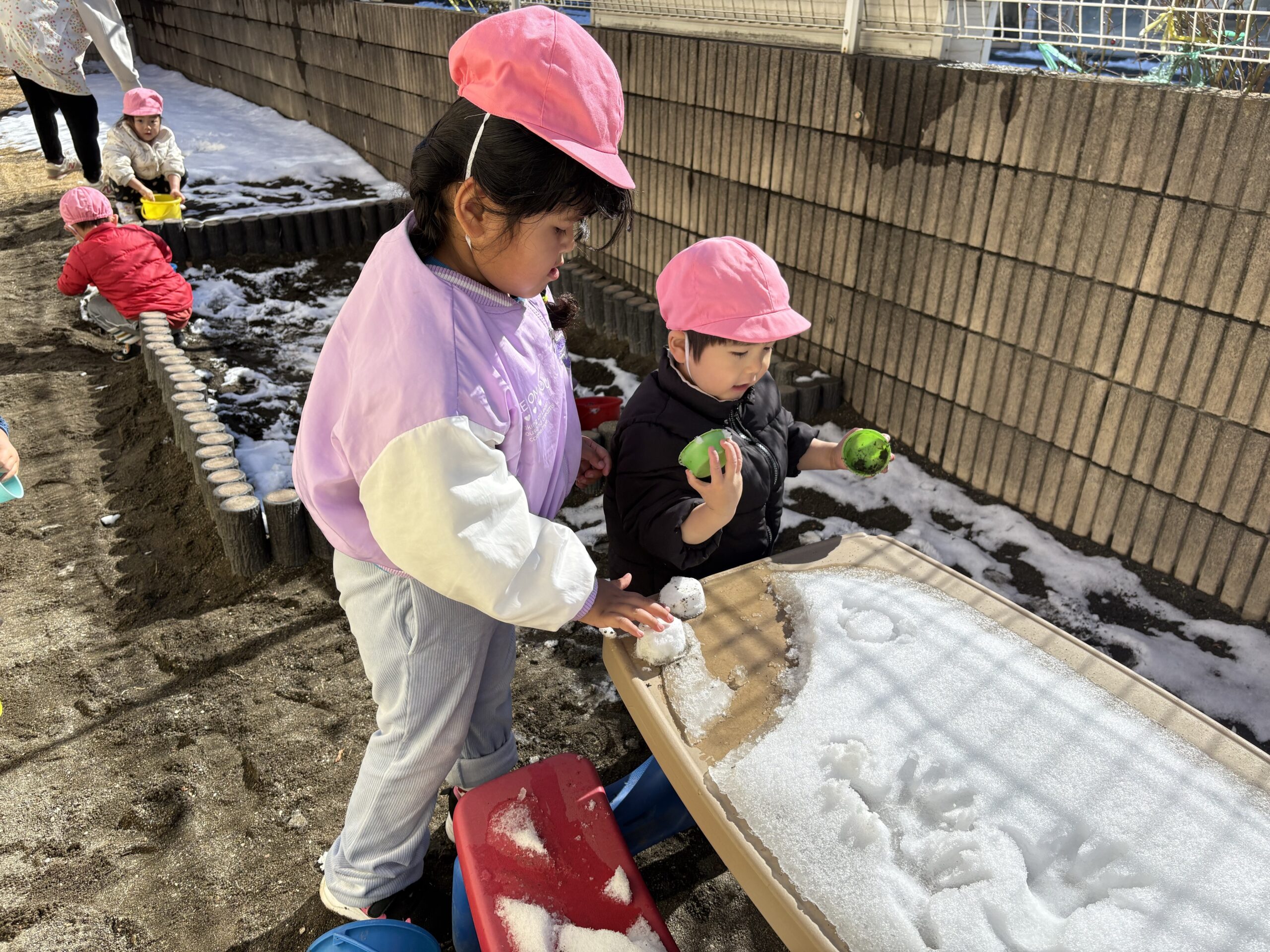 園庭に出ると「雪で何作ろっか〜」と玩具を持ってウキウキなはな組さん♬