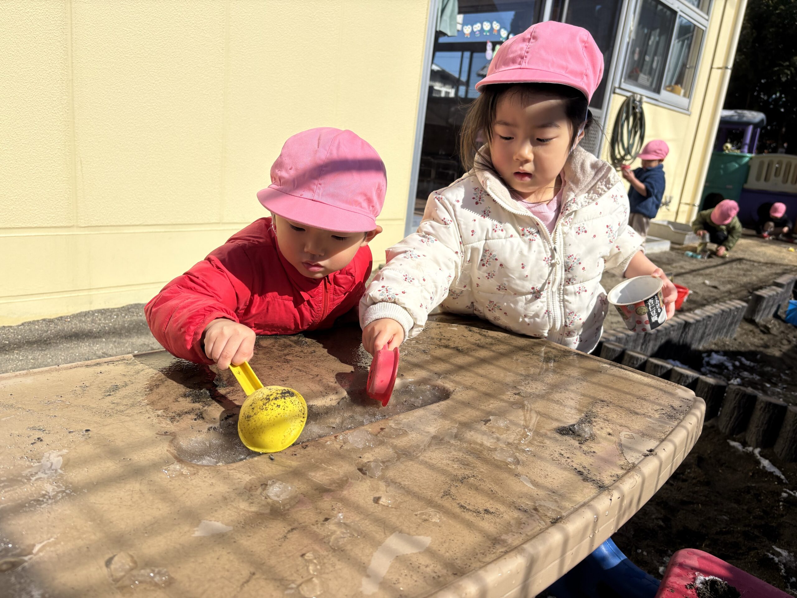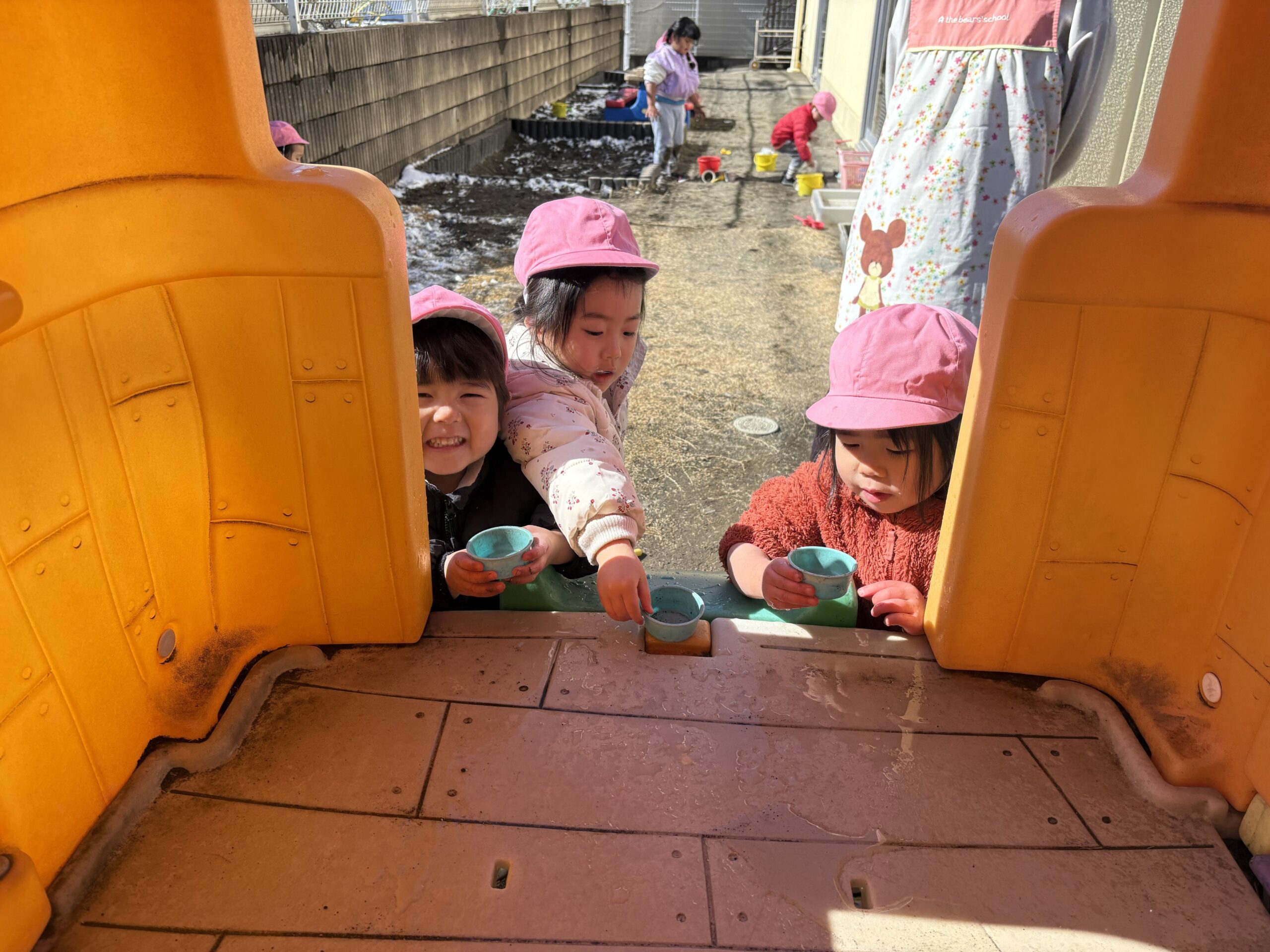 遊具に積もった雪が溶けて雫が落ちてきているのを見つけてカップに入るかな?と集めています。「あ!入った!」と雫がカップに沢山入ると嬉しそうに見せてくれました。