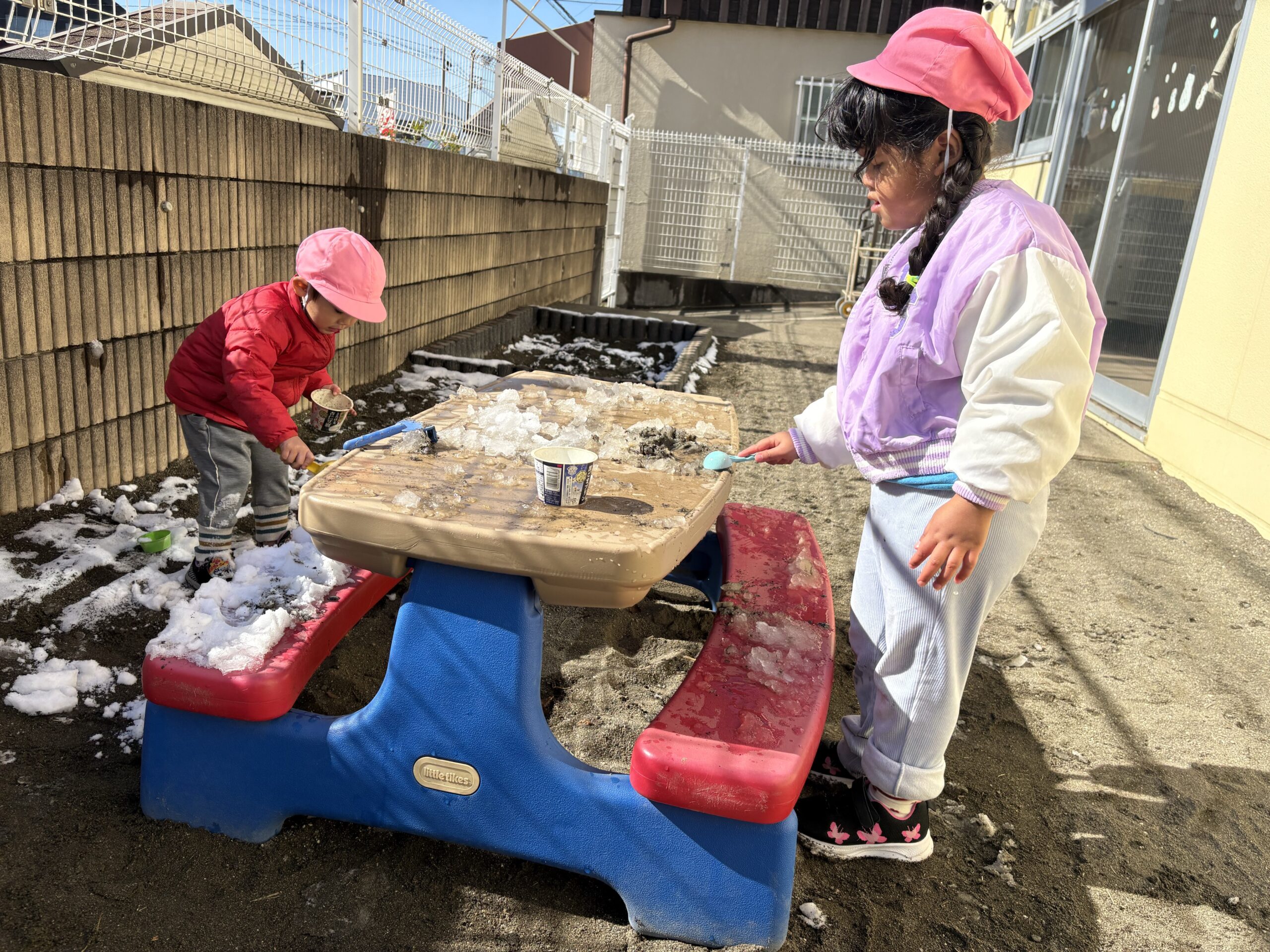「今日は滑り台できないね〜」「テーブルびしょびしょ!」と言って早く溶けてほしいようでした。