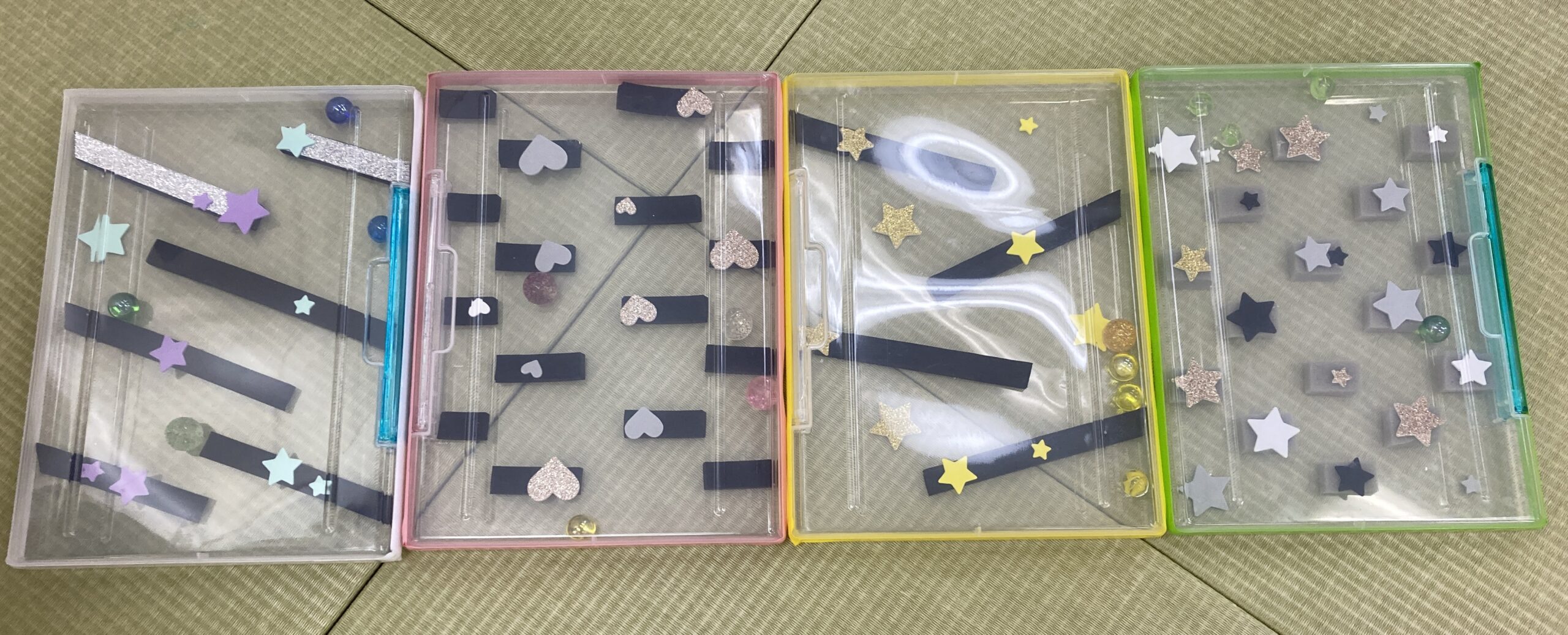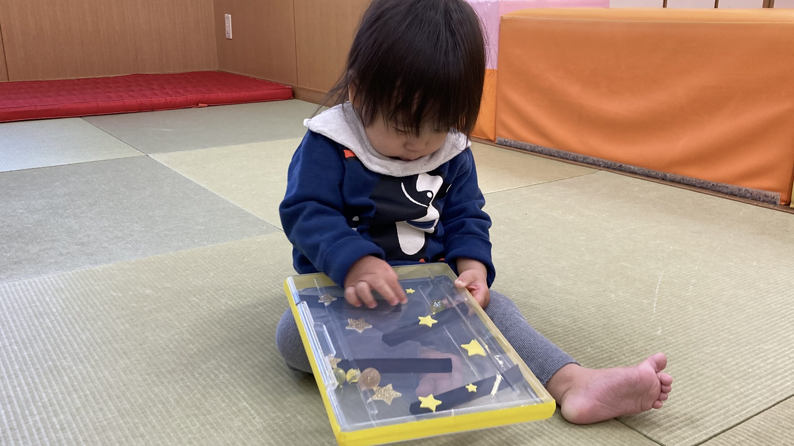 キラキラのスーパーボールやビー玉を転がす遊びに興味津々のひかり組さん。