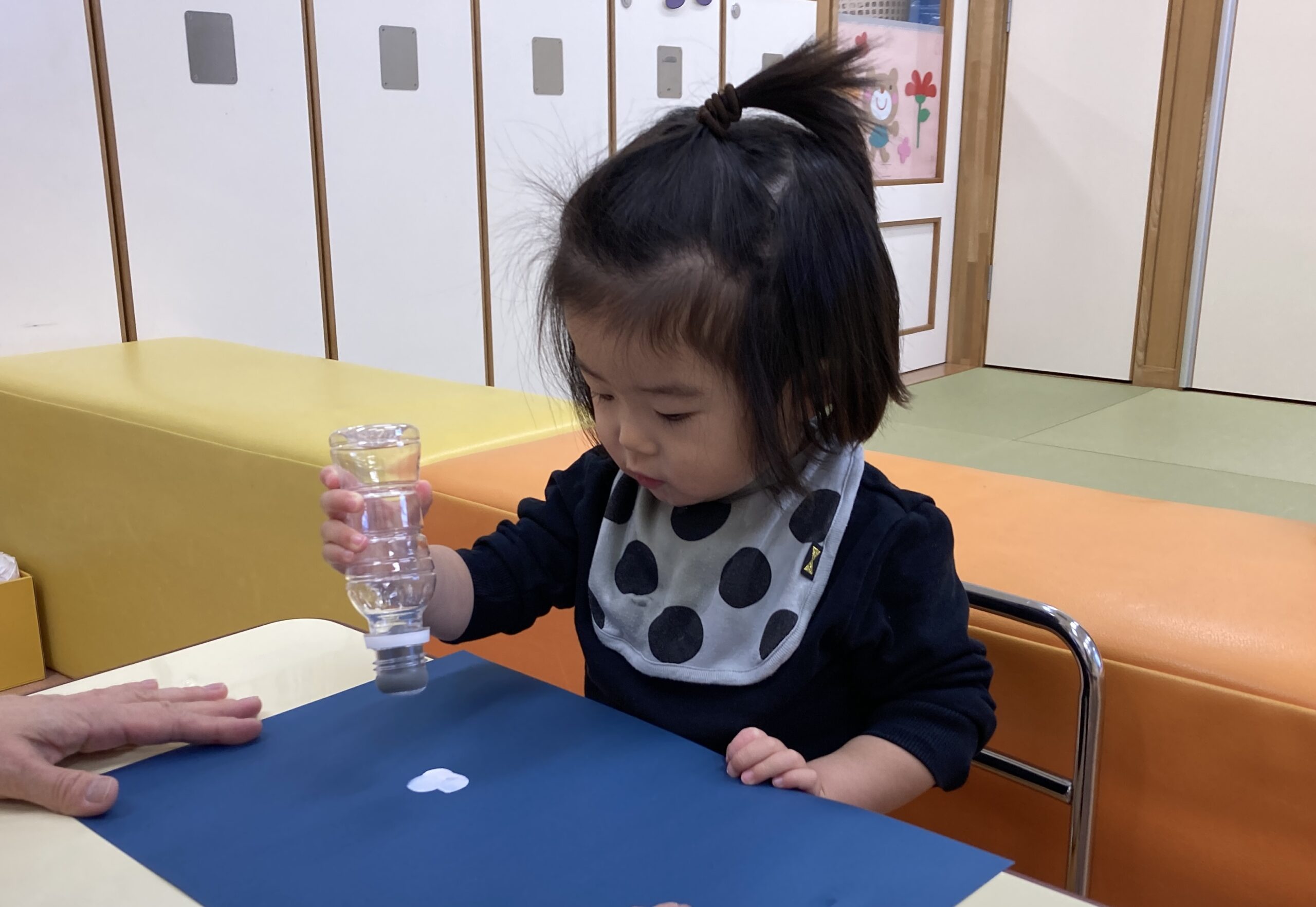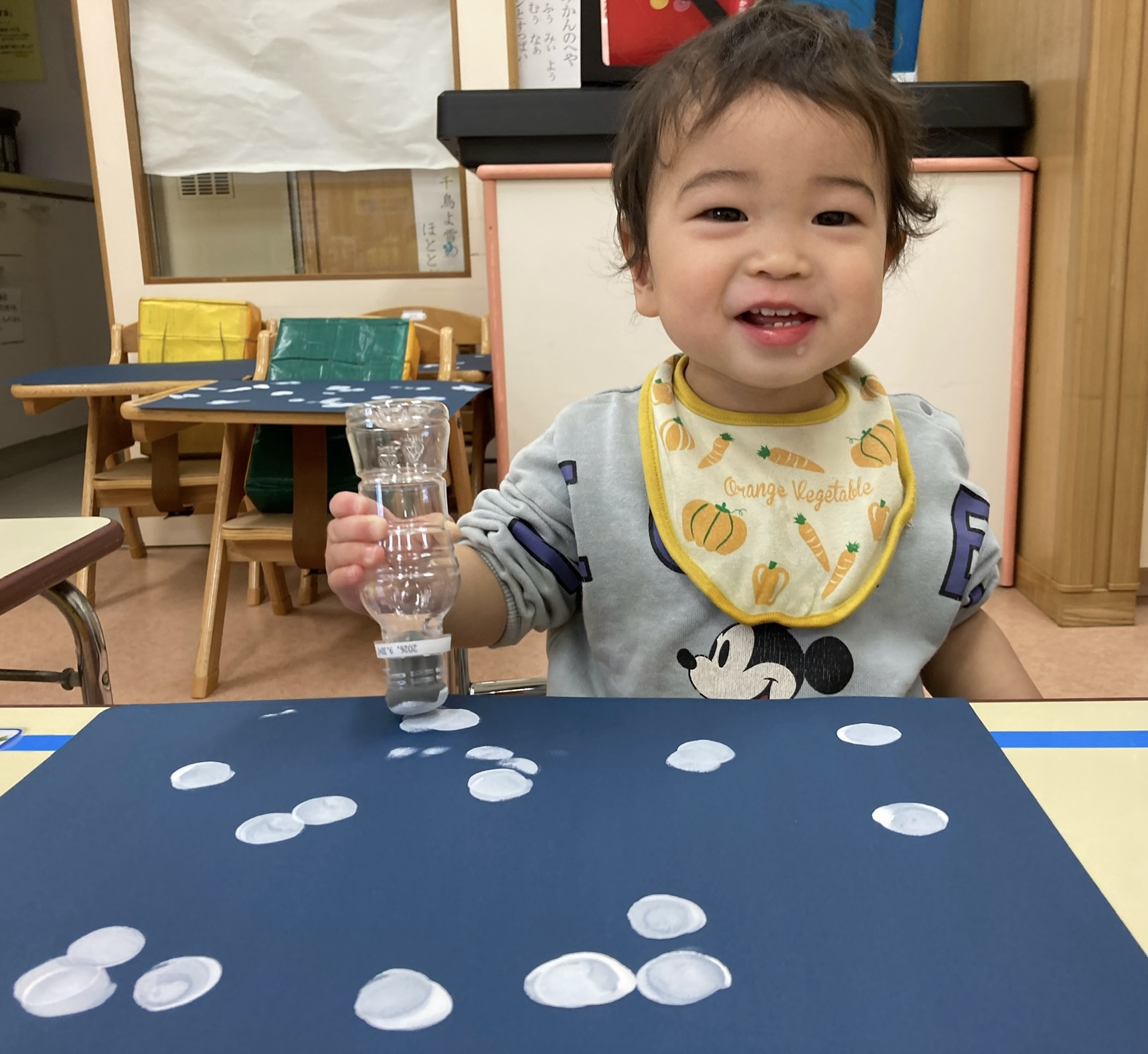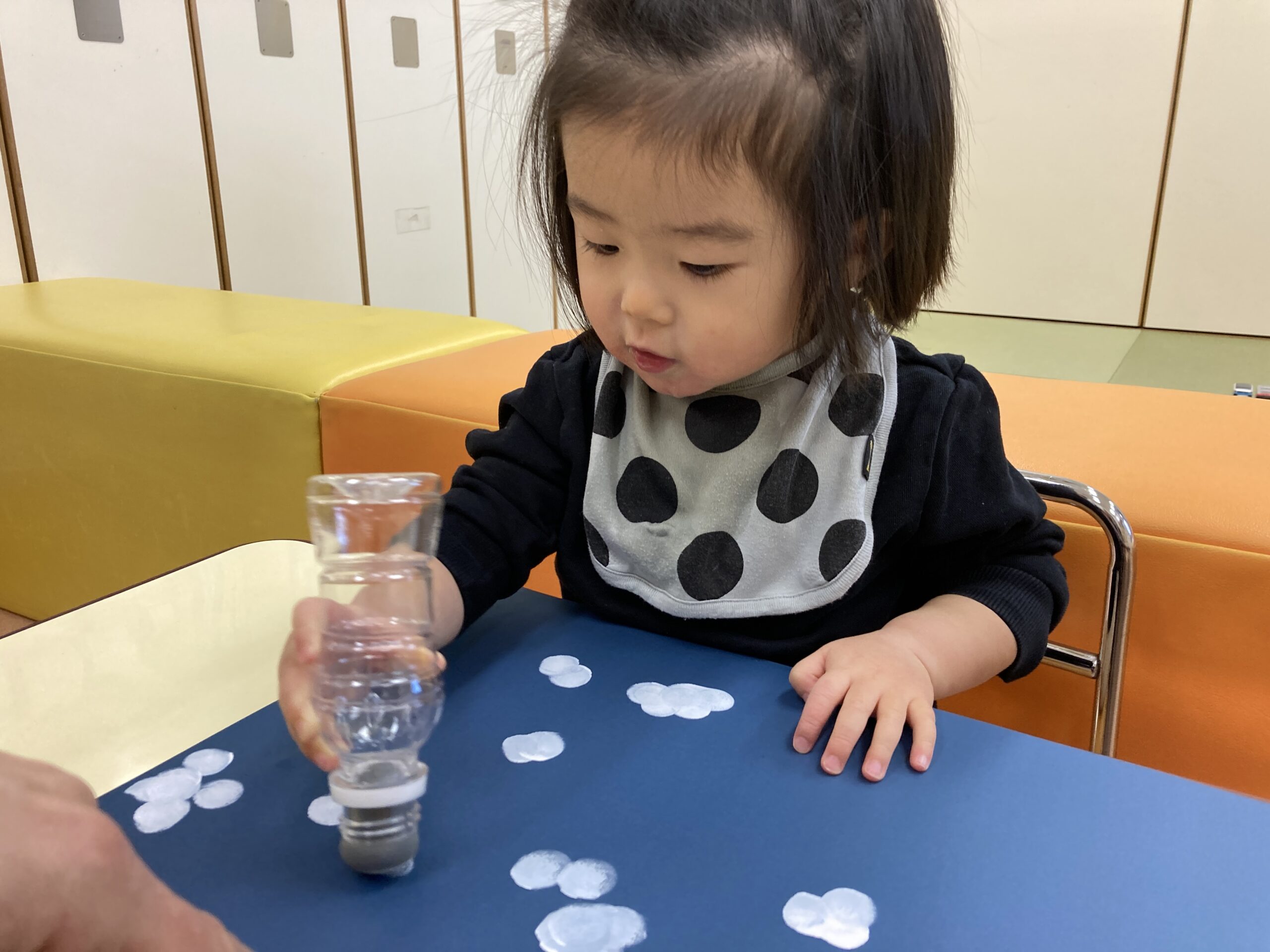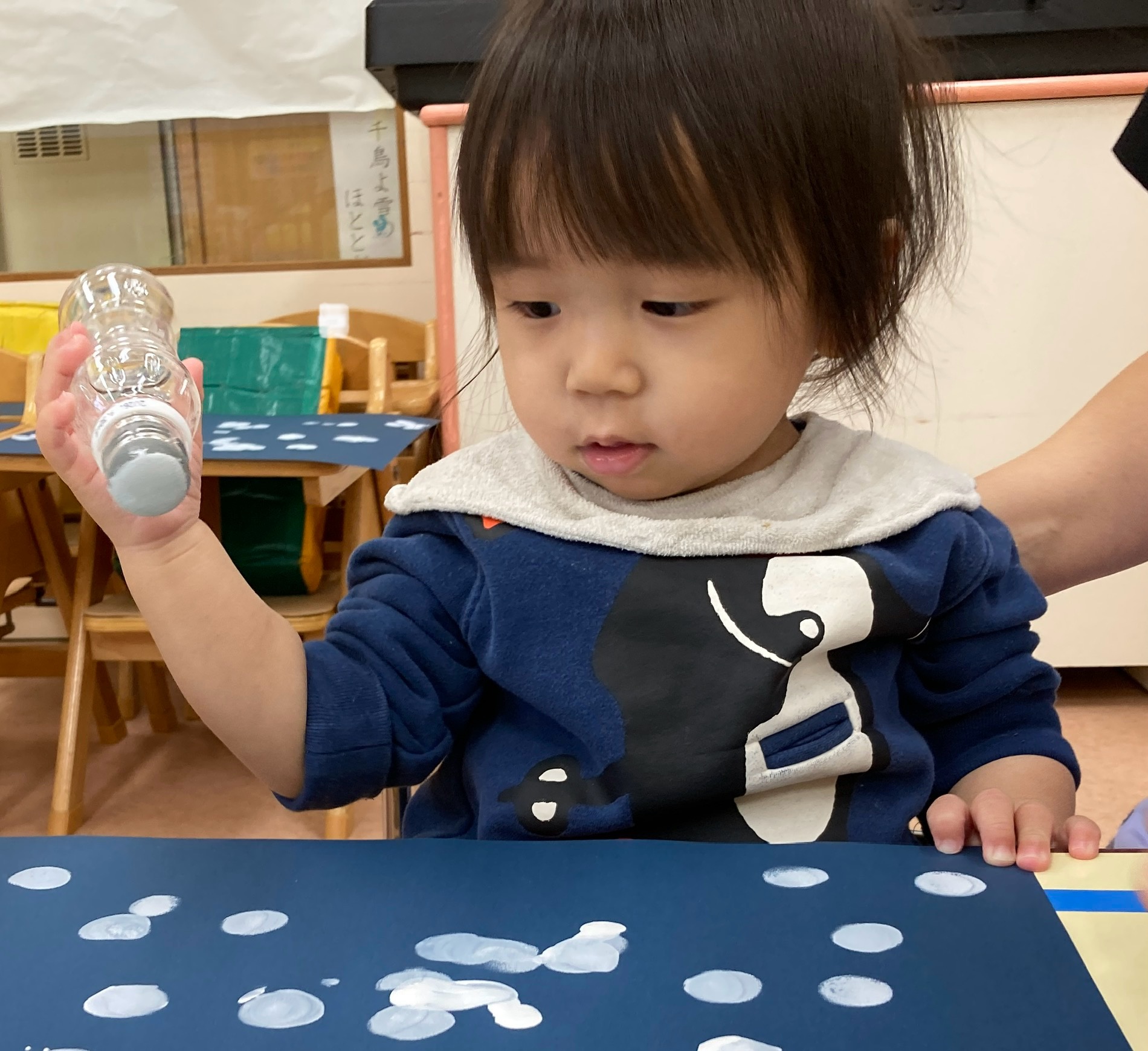 お化粧用のスポンジを細いペットボトルに差し込み、スタンプを作って雪を表現しました。スポンジに絵の具をつけると、不思議そうに見つめたり、そっと押してみたりする姿がみられました。