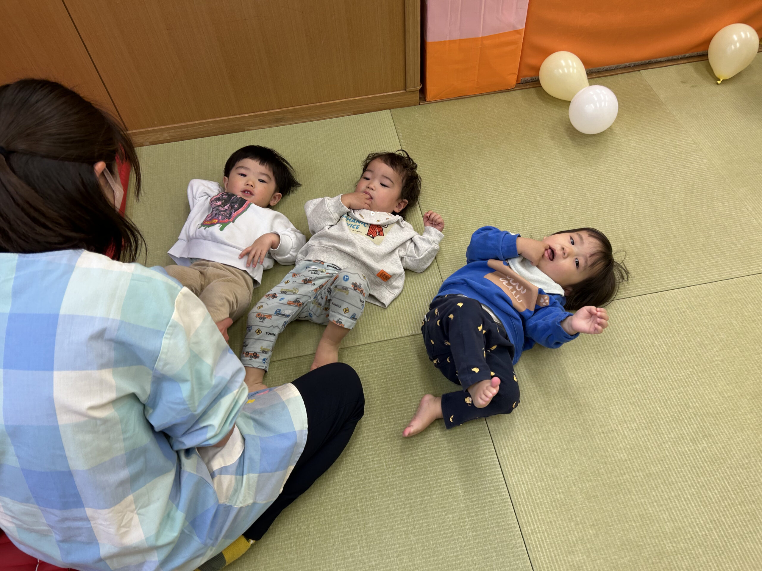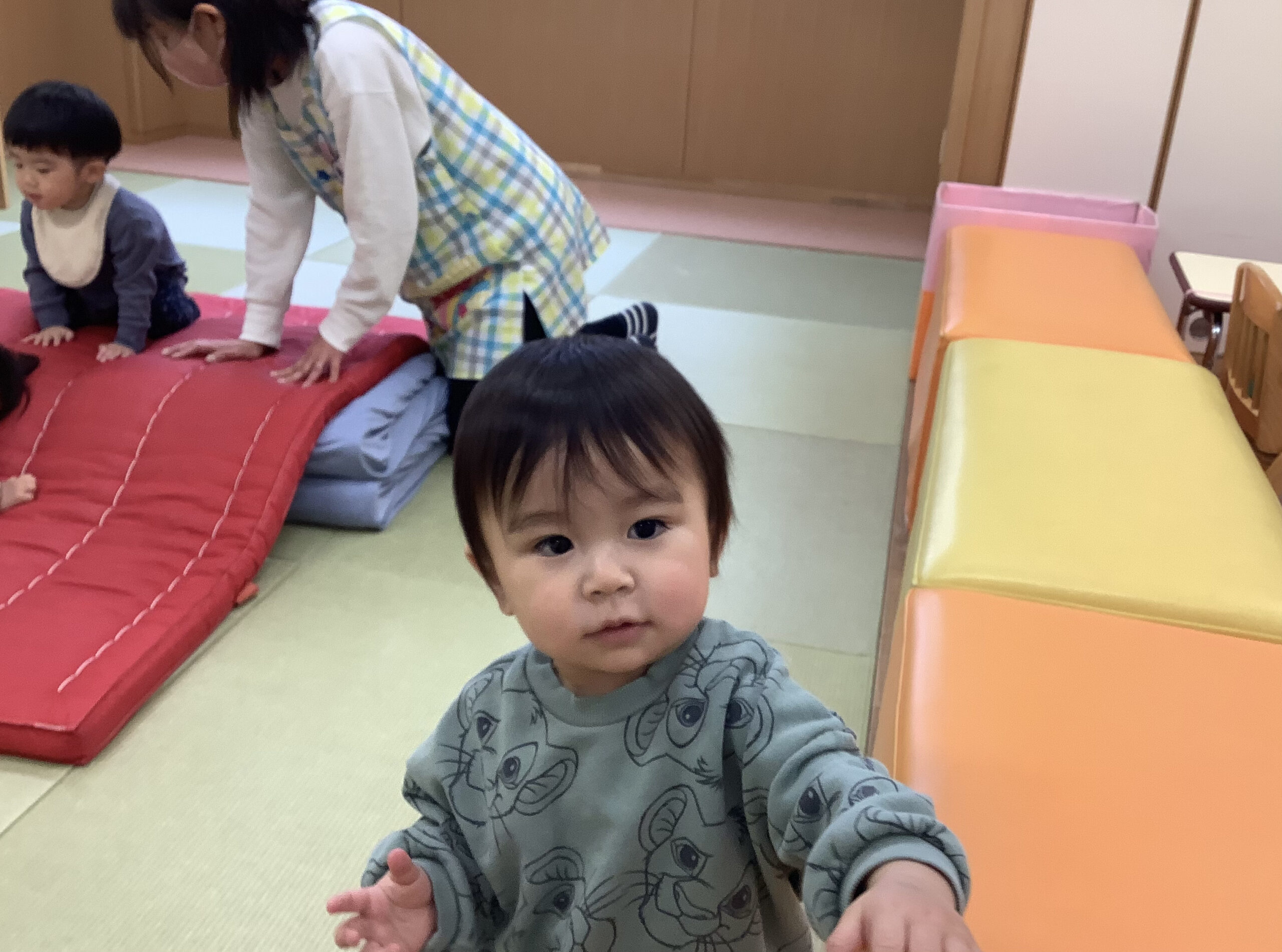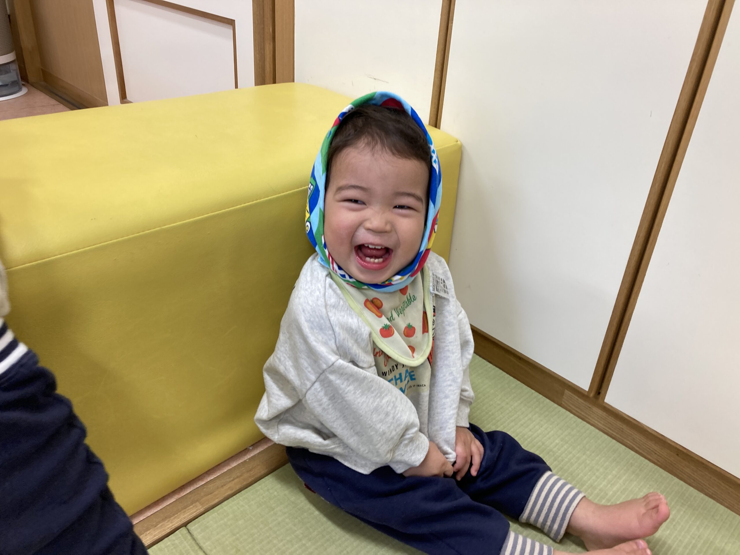 「いないいなーい」の声に合わせてしゃがんで「ばぁ!」と飛び出す遊びが大流行。なかなかタイミングが揃わず。でも、なんだか楽しくて自然と笑いが広がります。