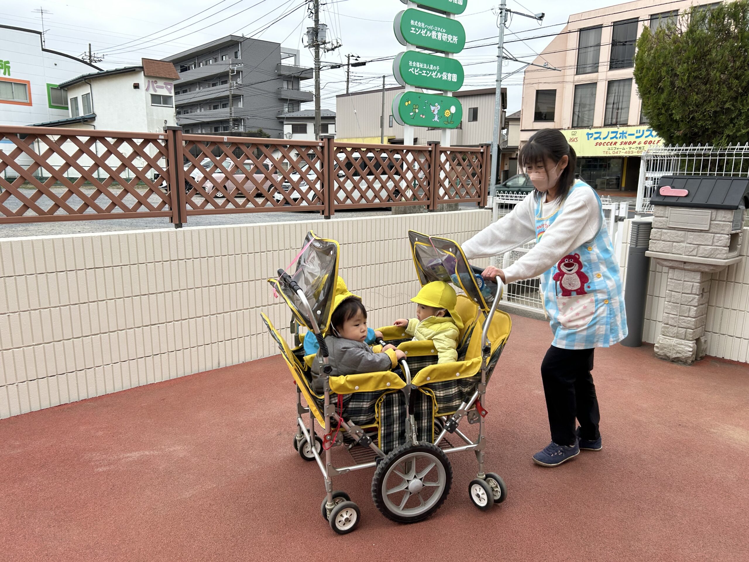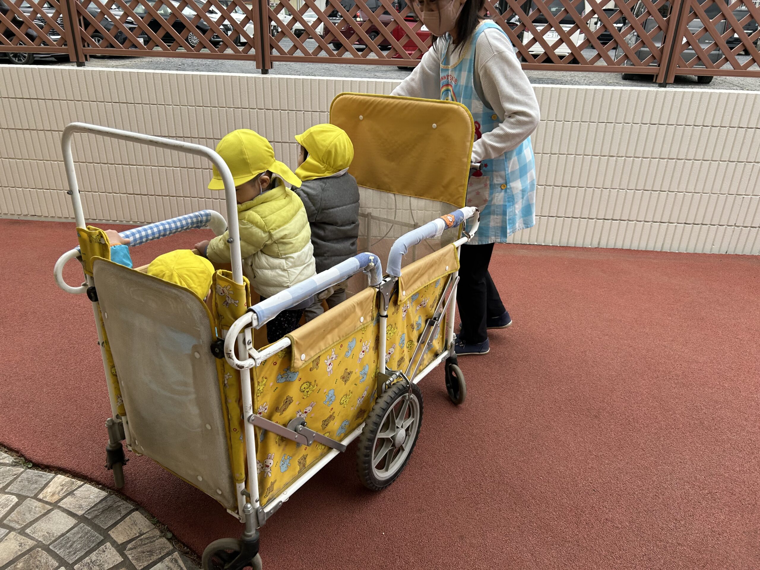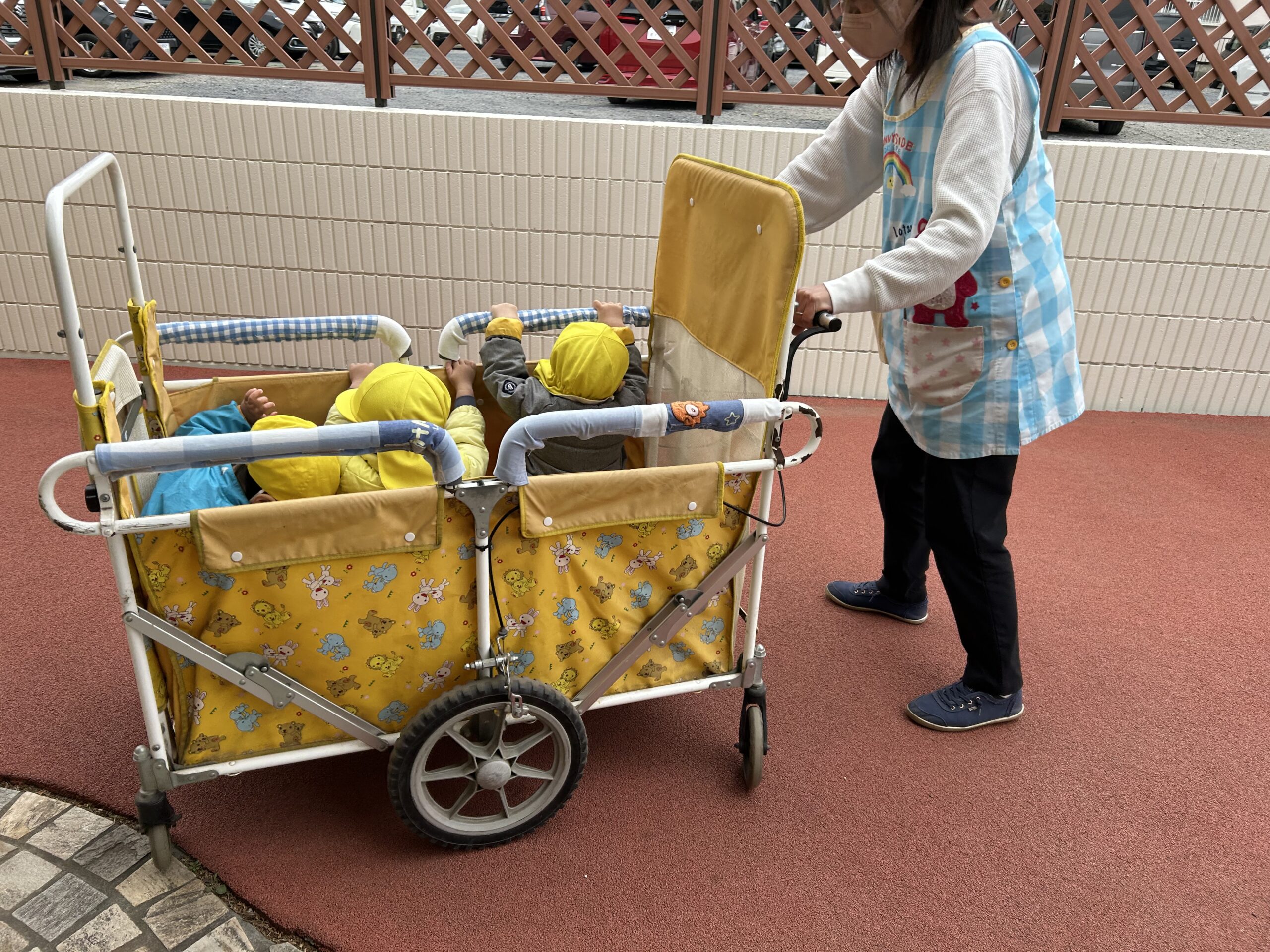 ひさしぶりに外に出ると4人用のバギーを見つけて「これに乗りたい!」と指差しするみんな。ちょっぴり体が大きくなったけれど、ひさしぶりに乗れてとっても満足そうな表情。でも、やっぱり大きなバギーの方がお気に入りのようです。