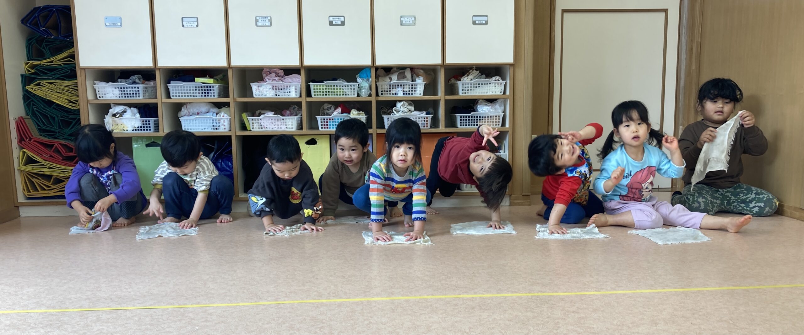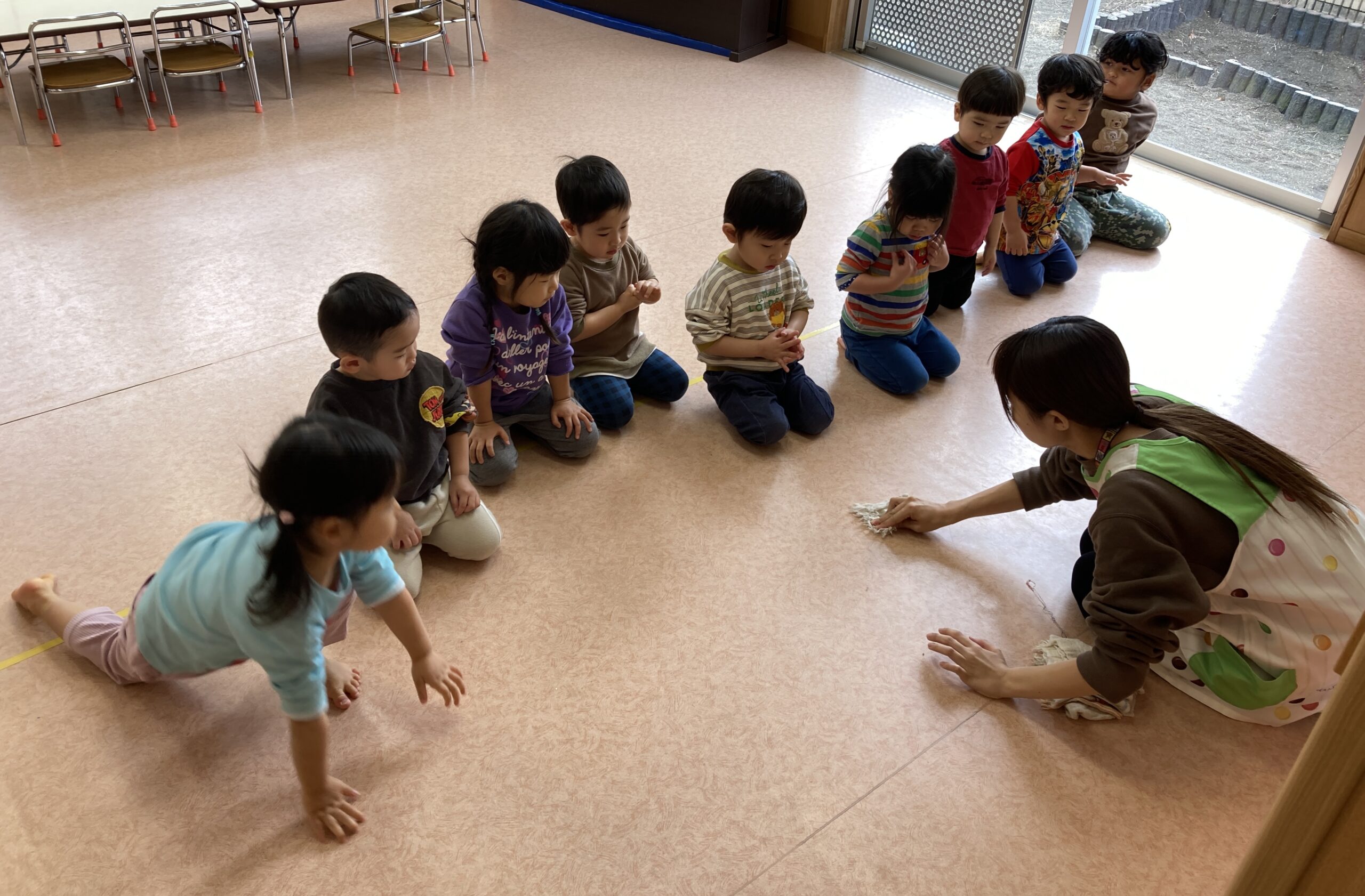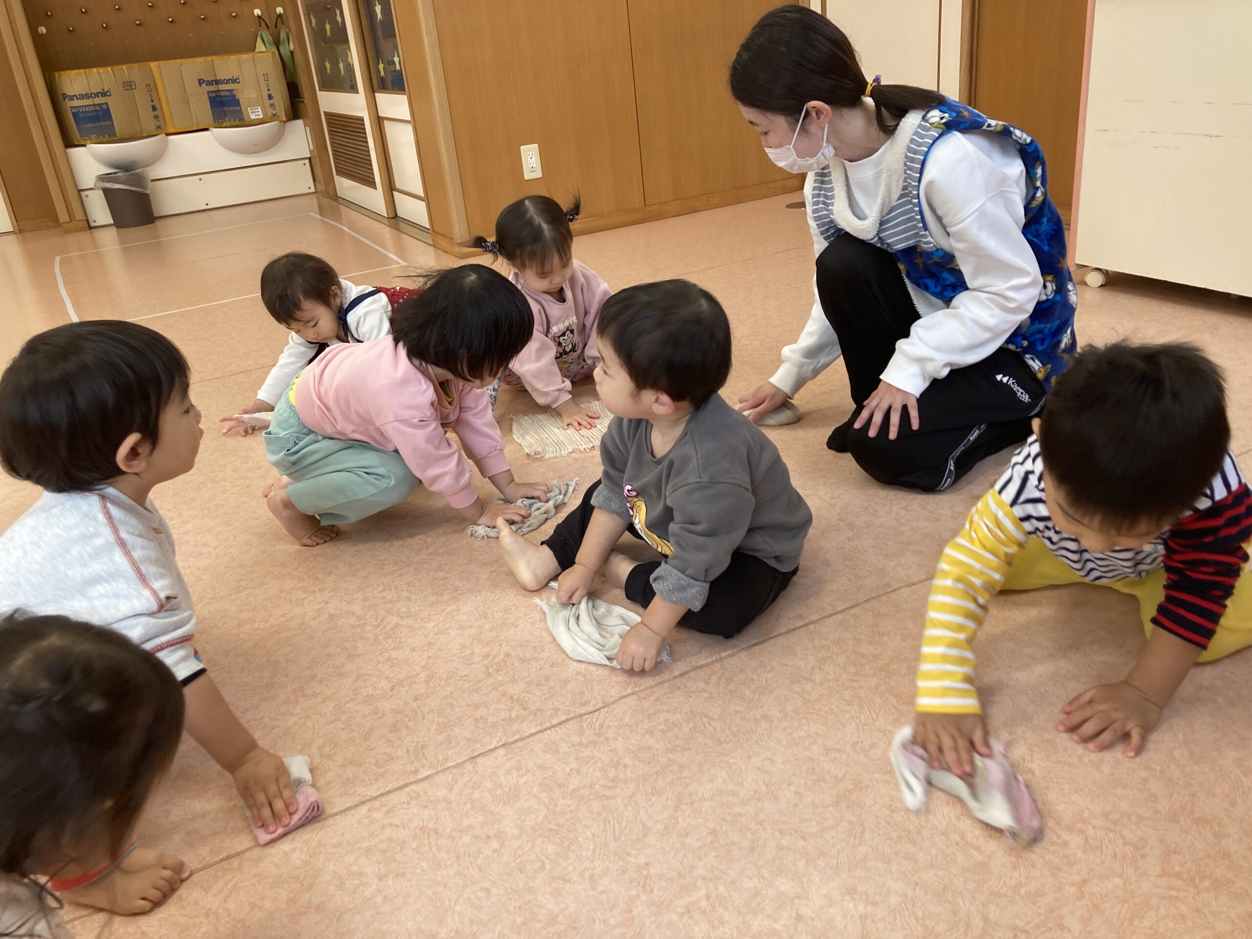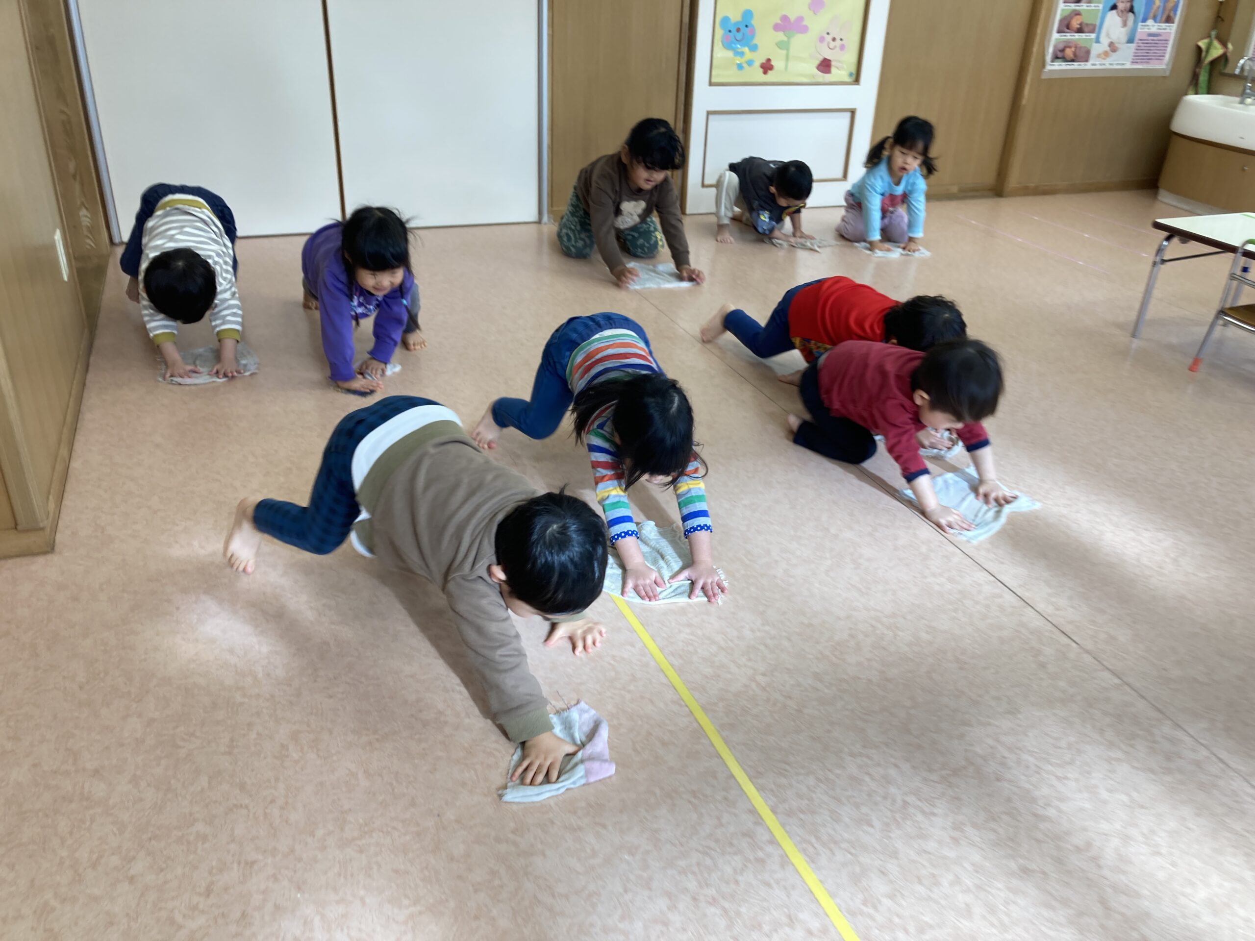 両手でしっかり雑巾を持ち、保育士と一緒に前へ前へ。最初はうまく進めない子もいましたが段々コツをつかみ楽しそうに体を動かしながら床をきれいにしてくれました。