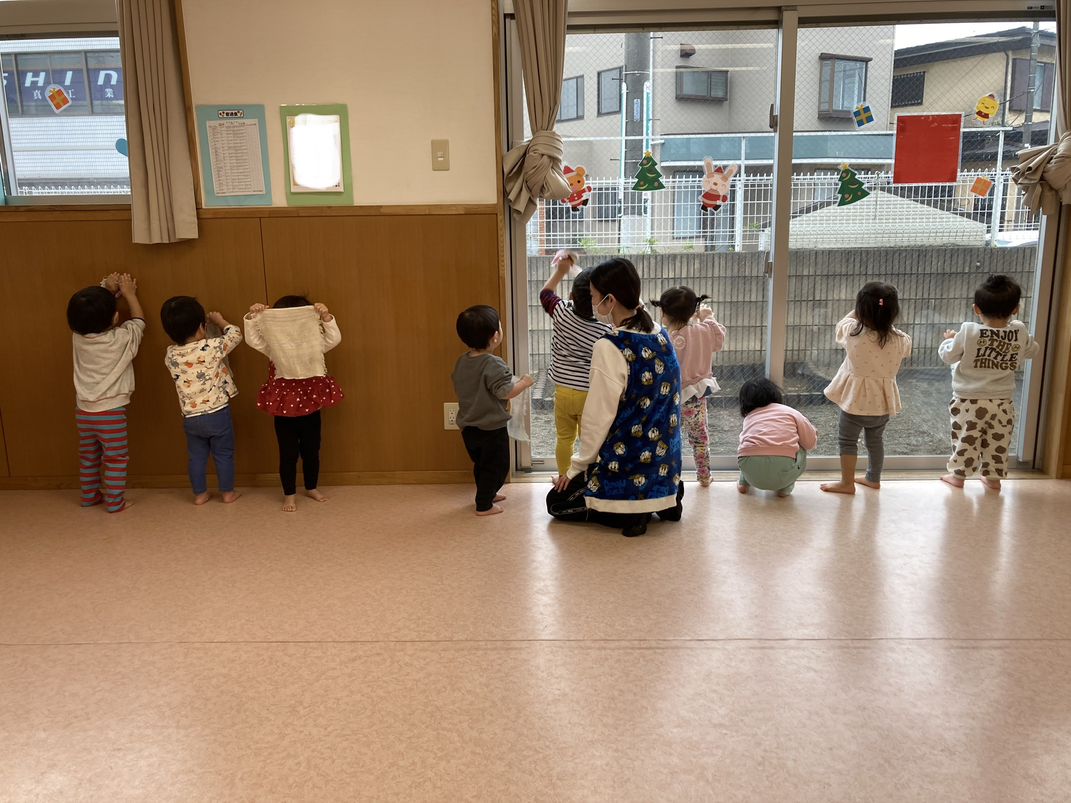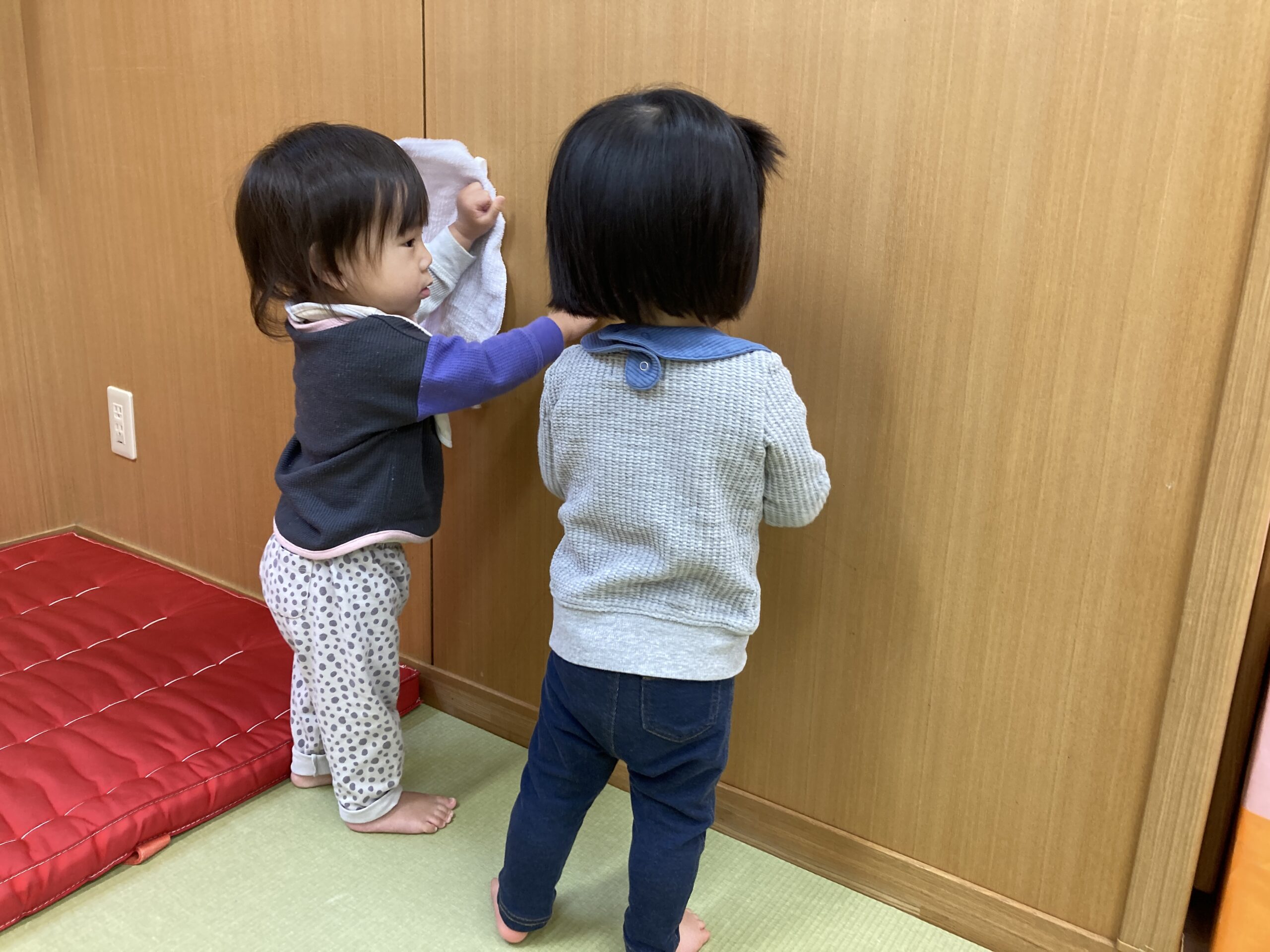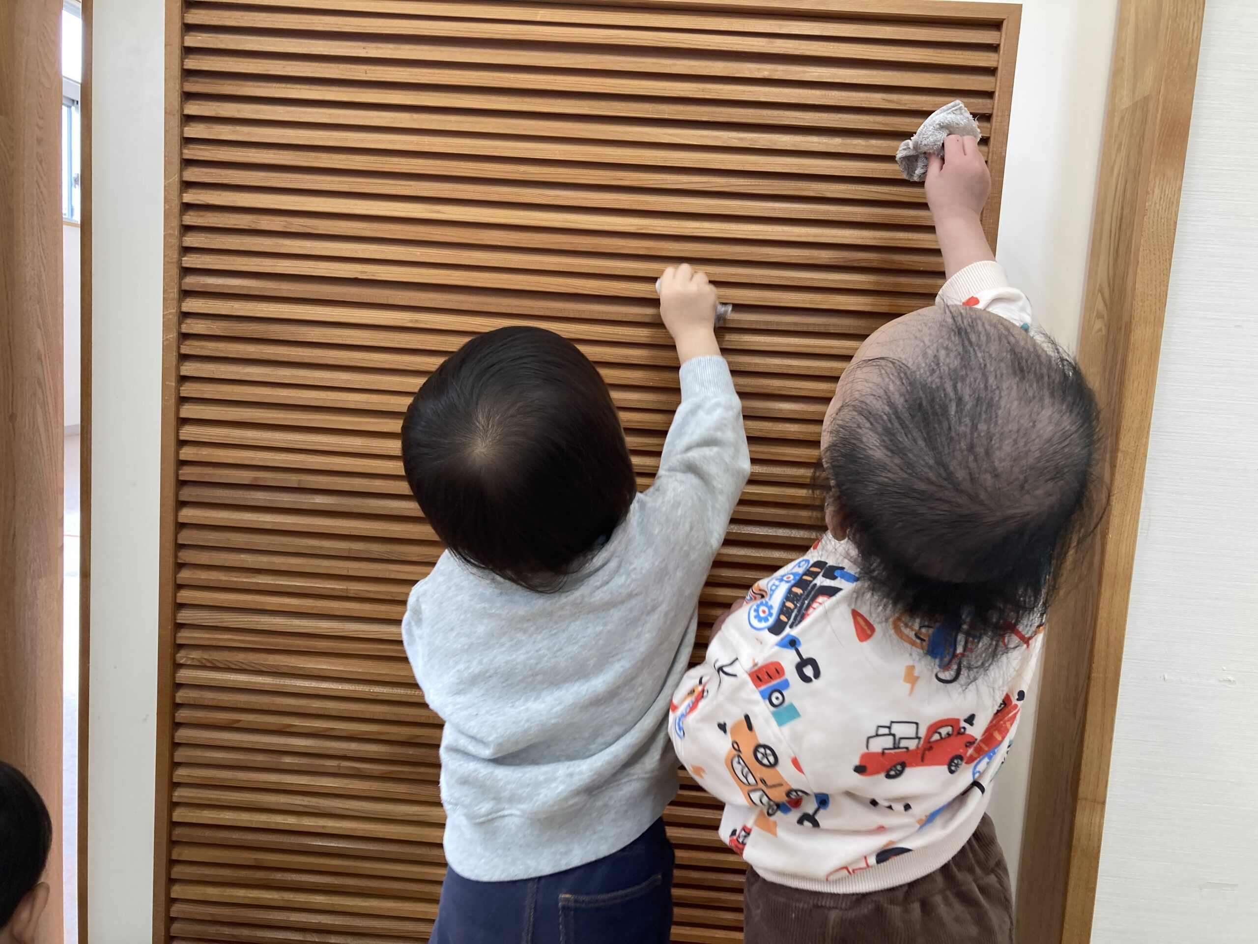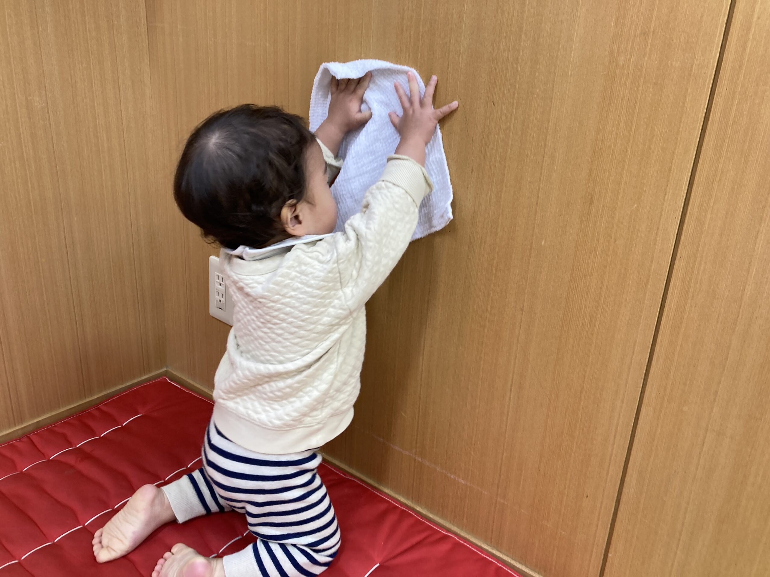 「ごしごし」の掛け声に合わせて、壁や床を拭いたりと子どもたちは、一生懸命!小さな手で雑巾を握り、真剣な表情で取り組んでいましたよ♬