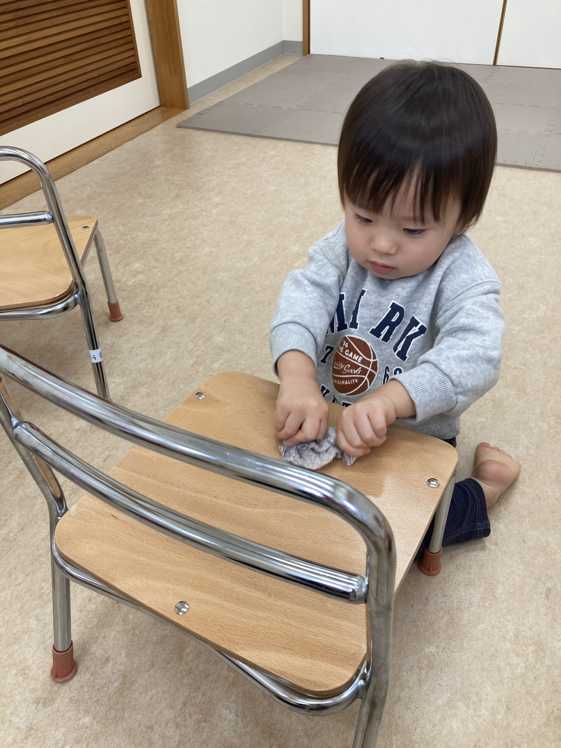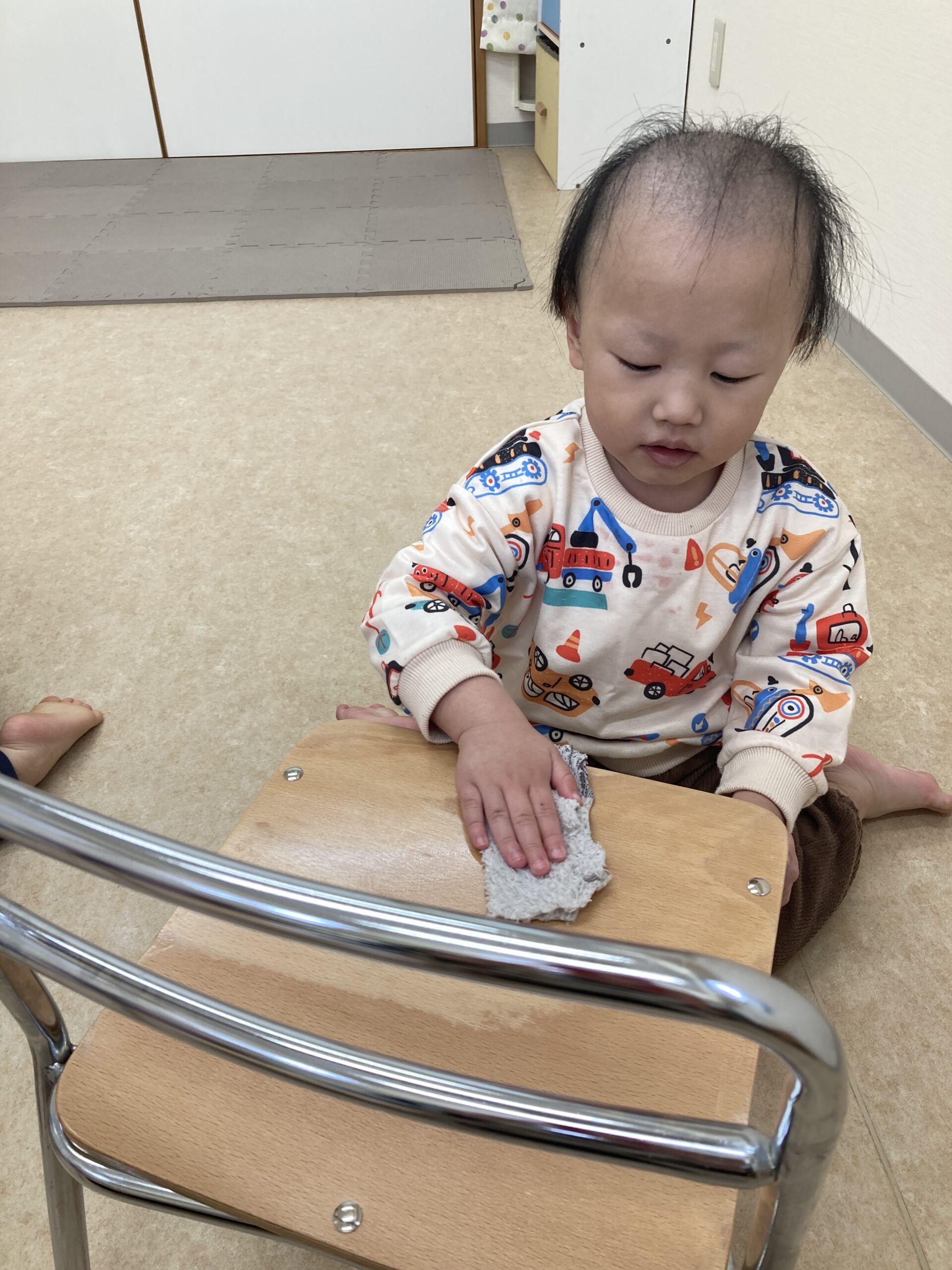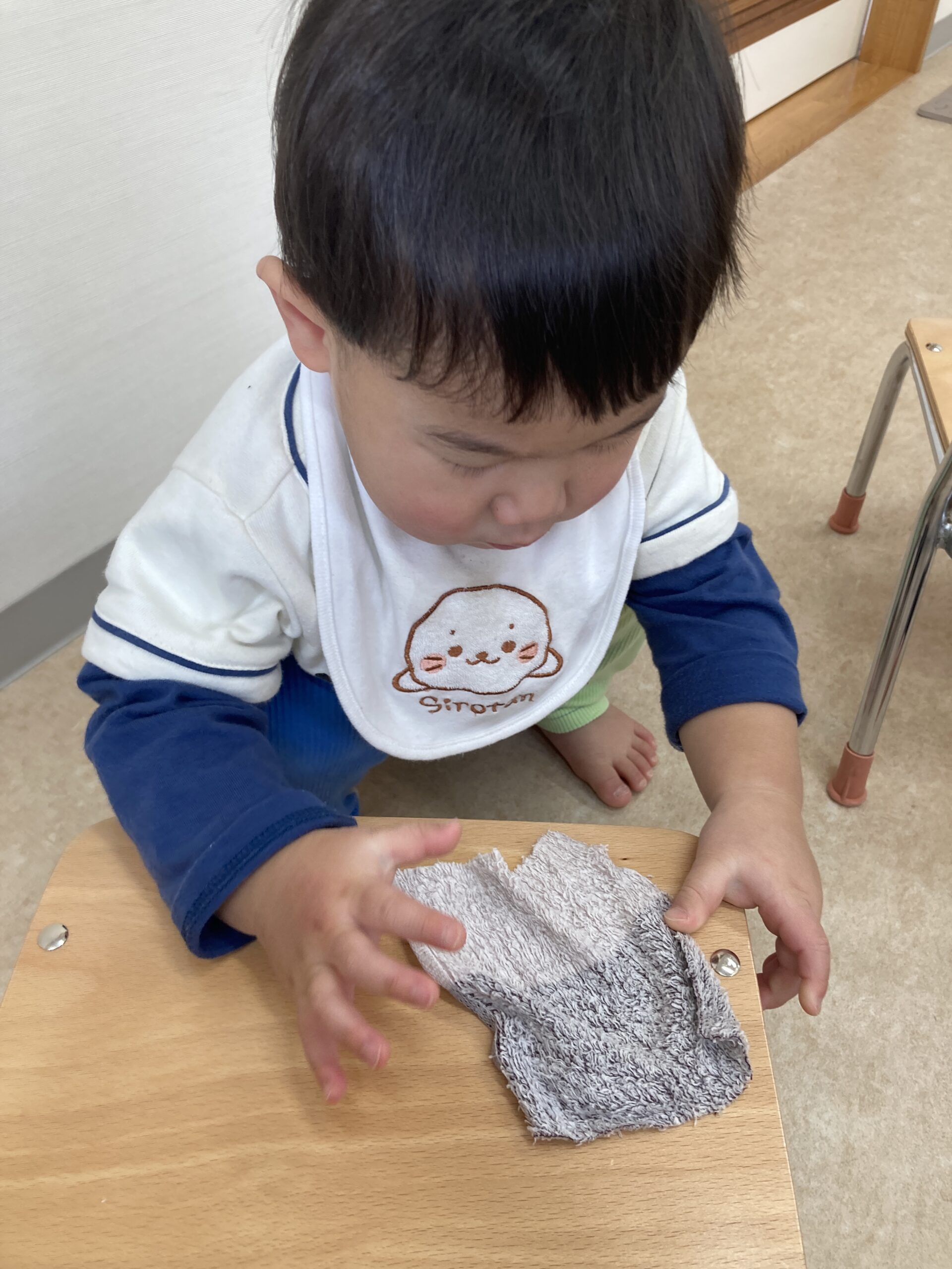 そら組さんも雑巾を持って椅子をふきふき。この真剣な表情!