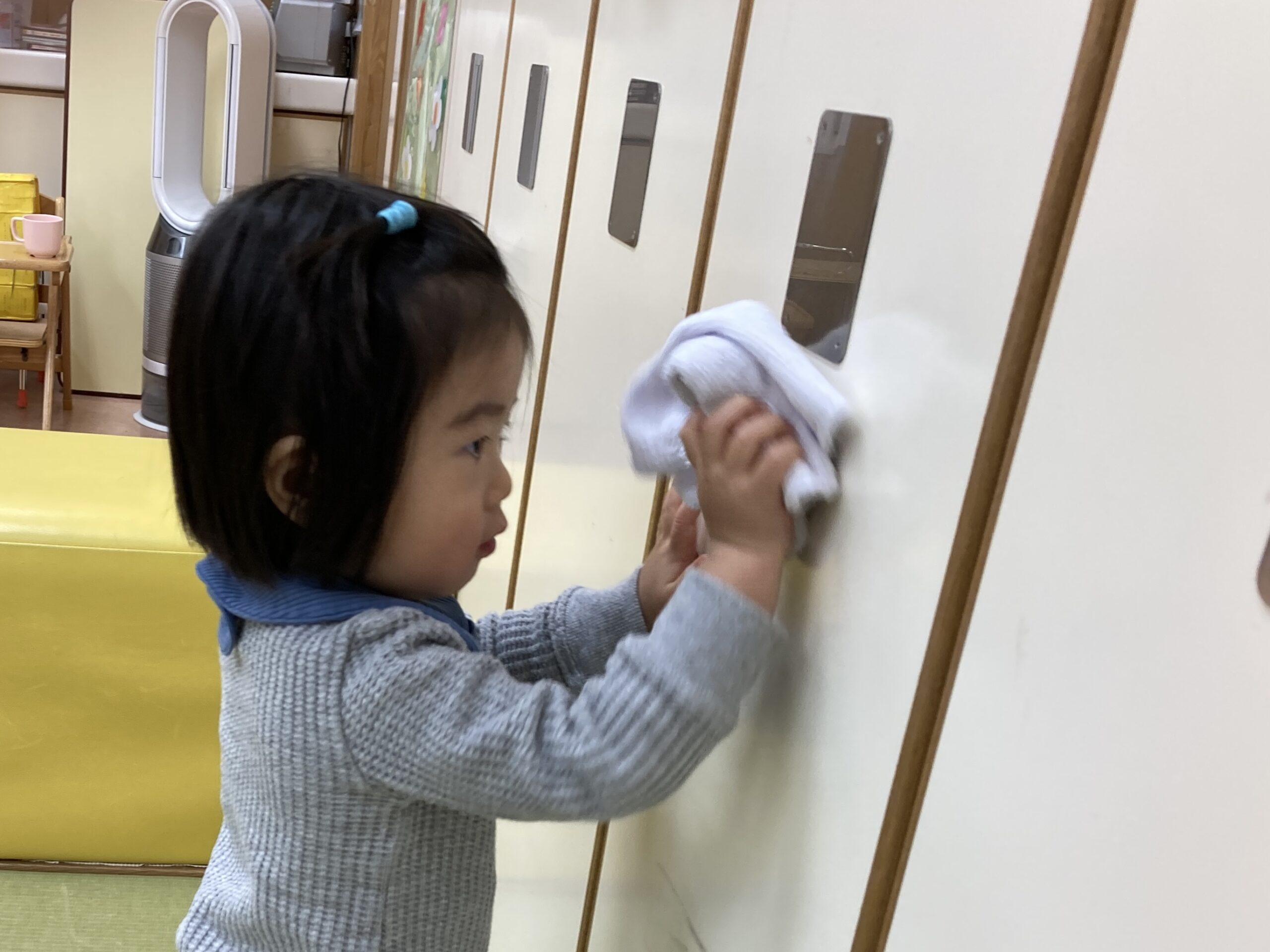 まずは自分の棚からスタート。雑巾を持ってしっかり拭いていました。いつも使っている場所だからこそ、真剣な表情で取り組む姿が見られました。