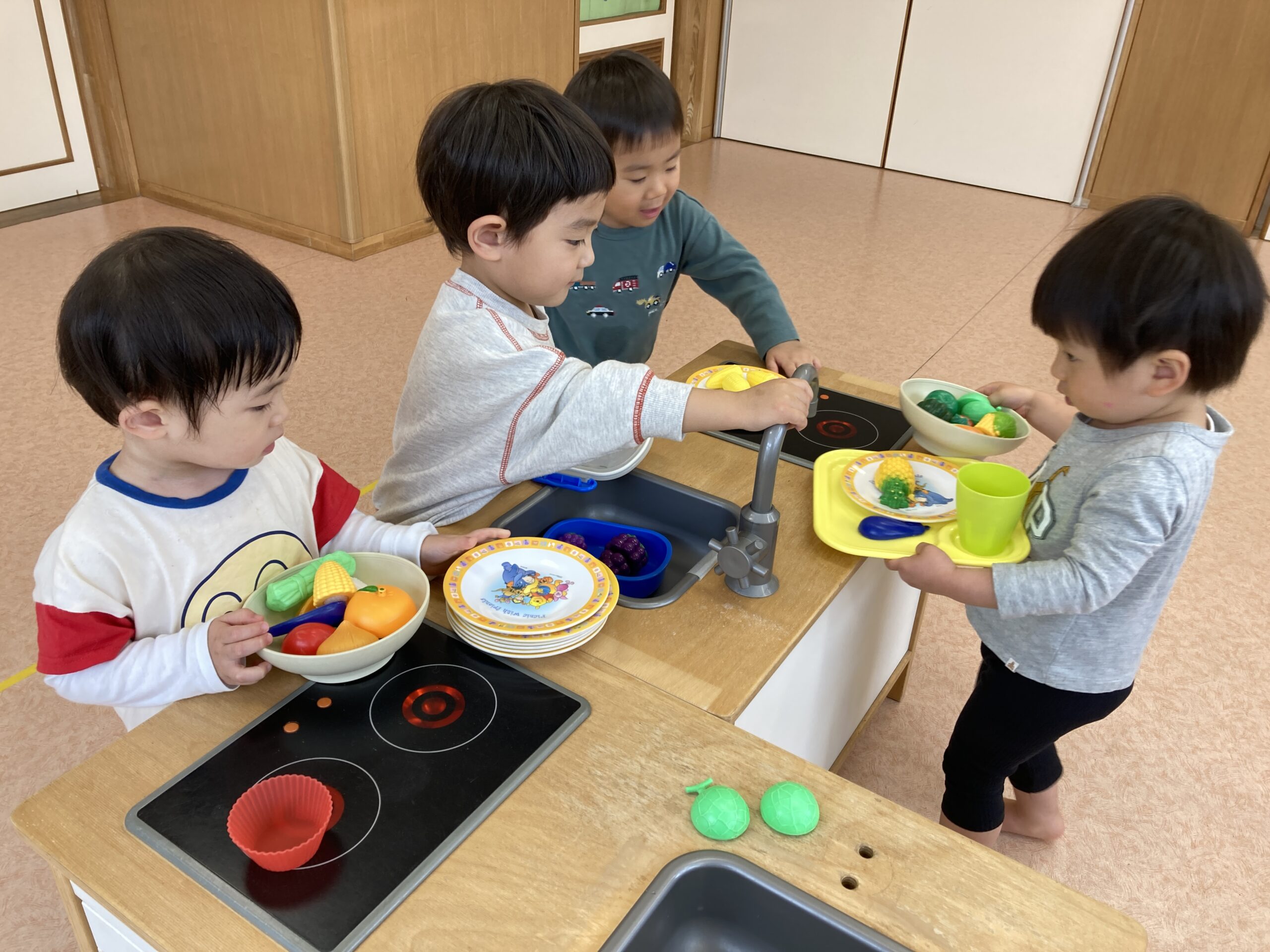 お部屋では、キッチンをだしておままごとをしました。普段あまり出さないのでとっても嬉しそうにお料理していました。