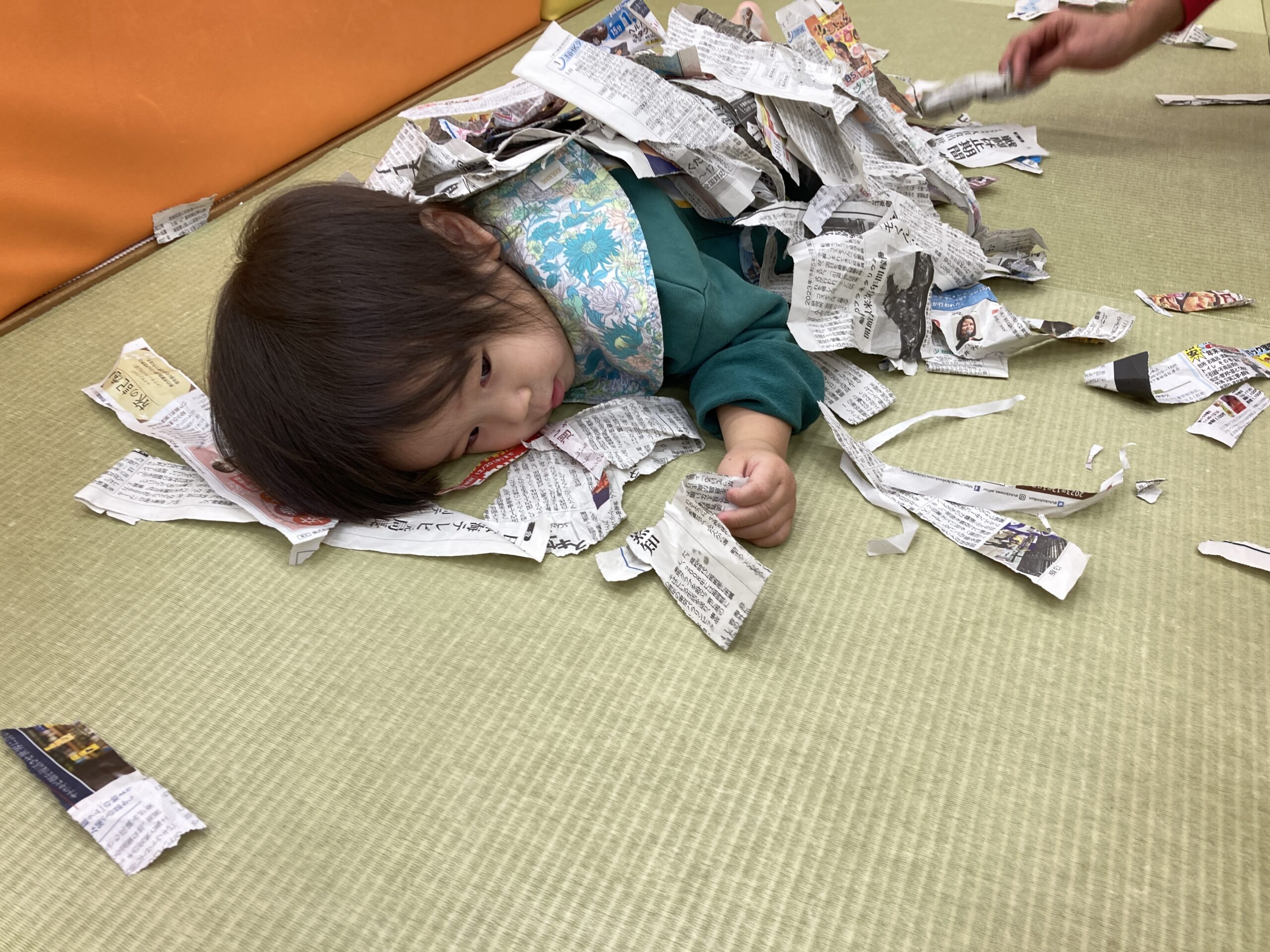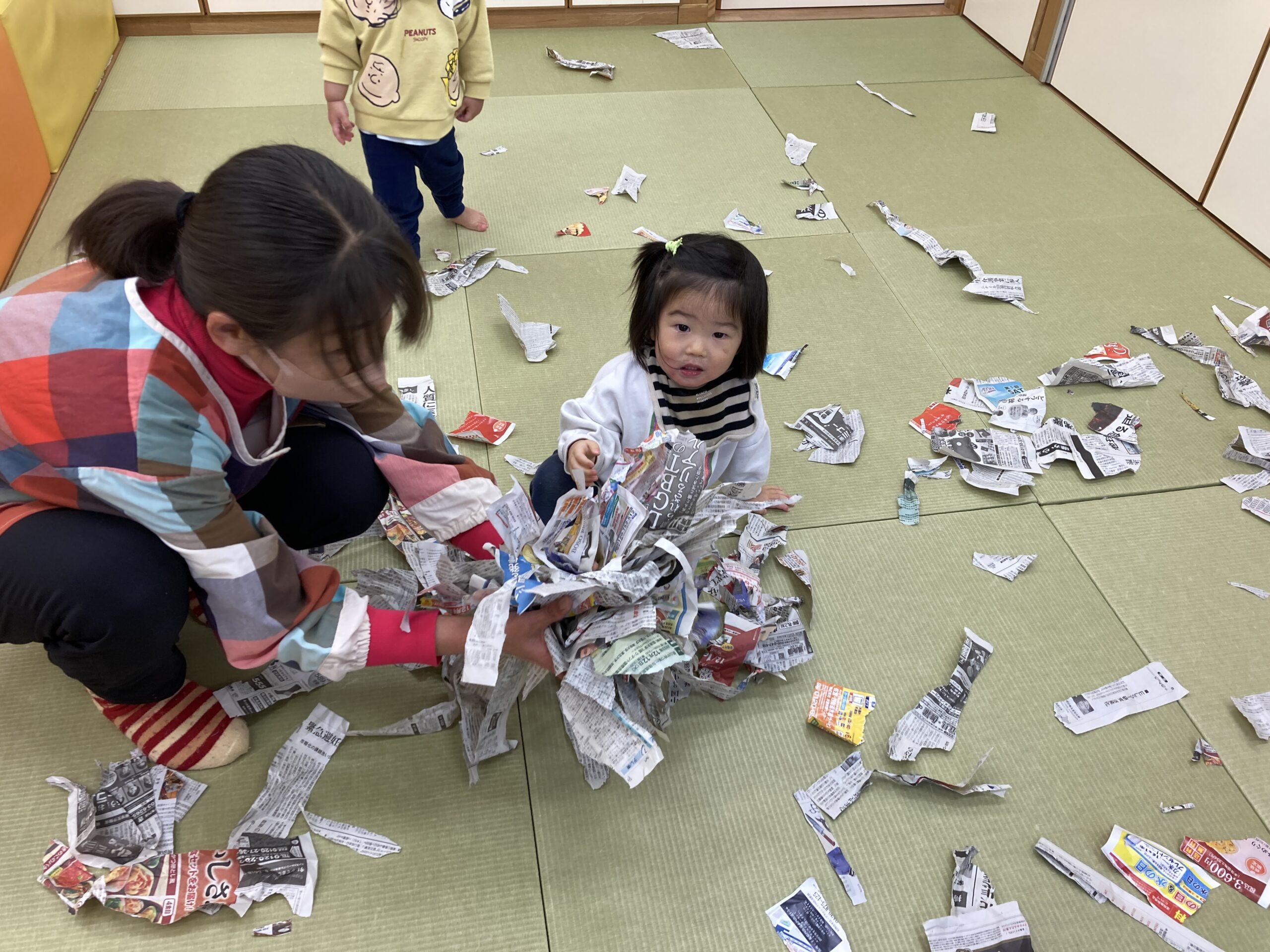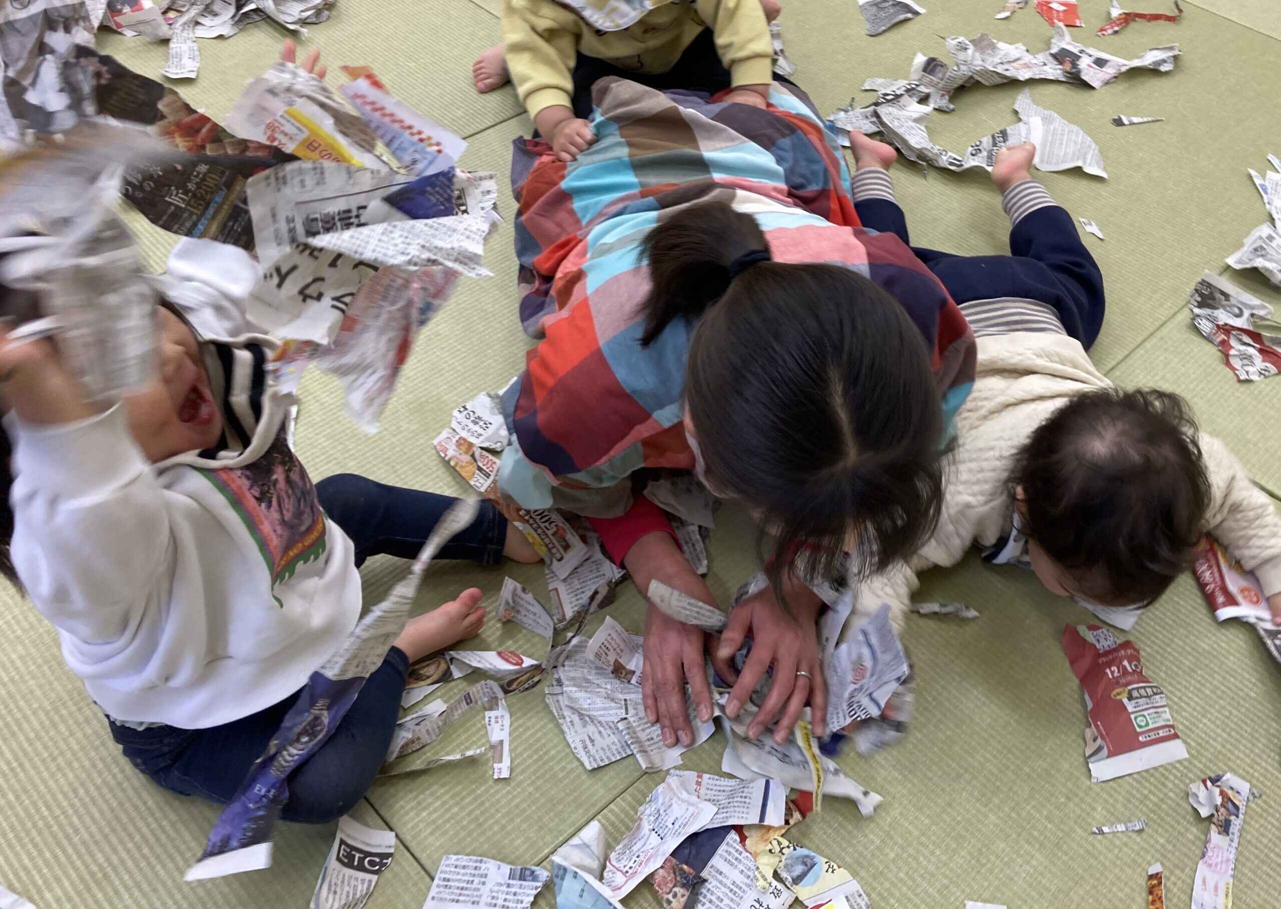 思いきり新聞遊びを楽しむひかり組さん♫