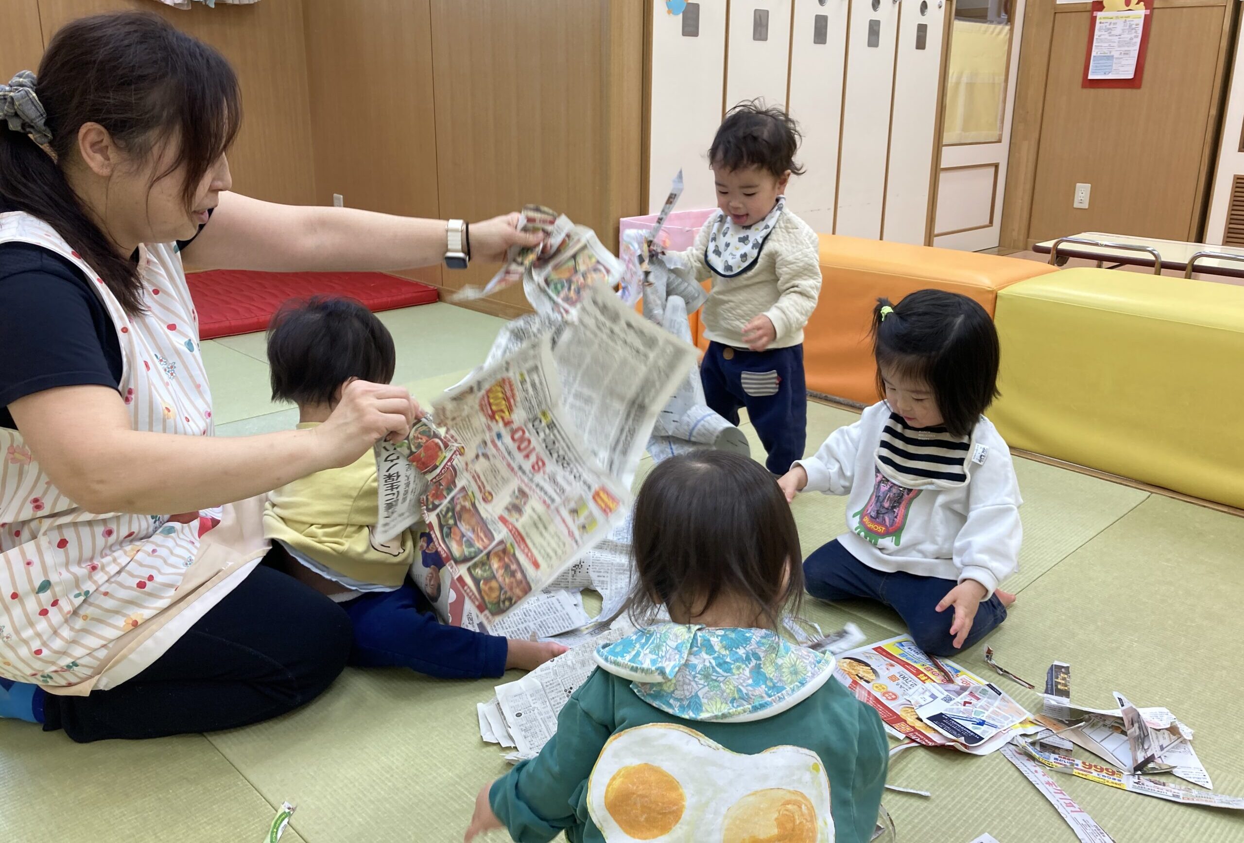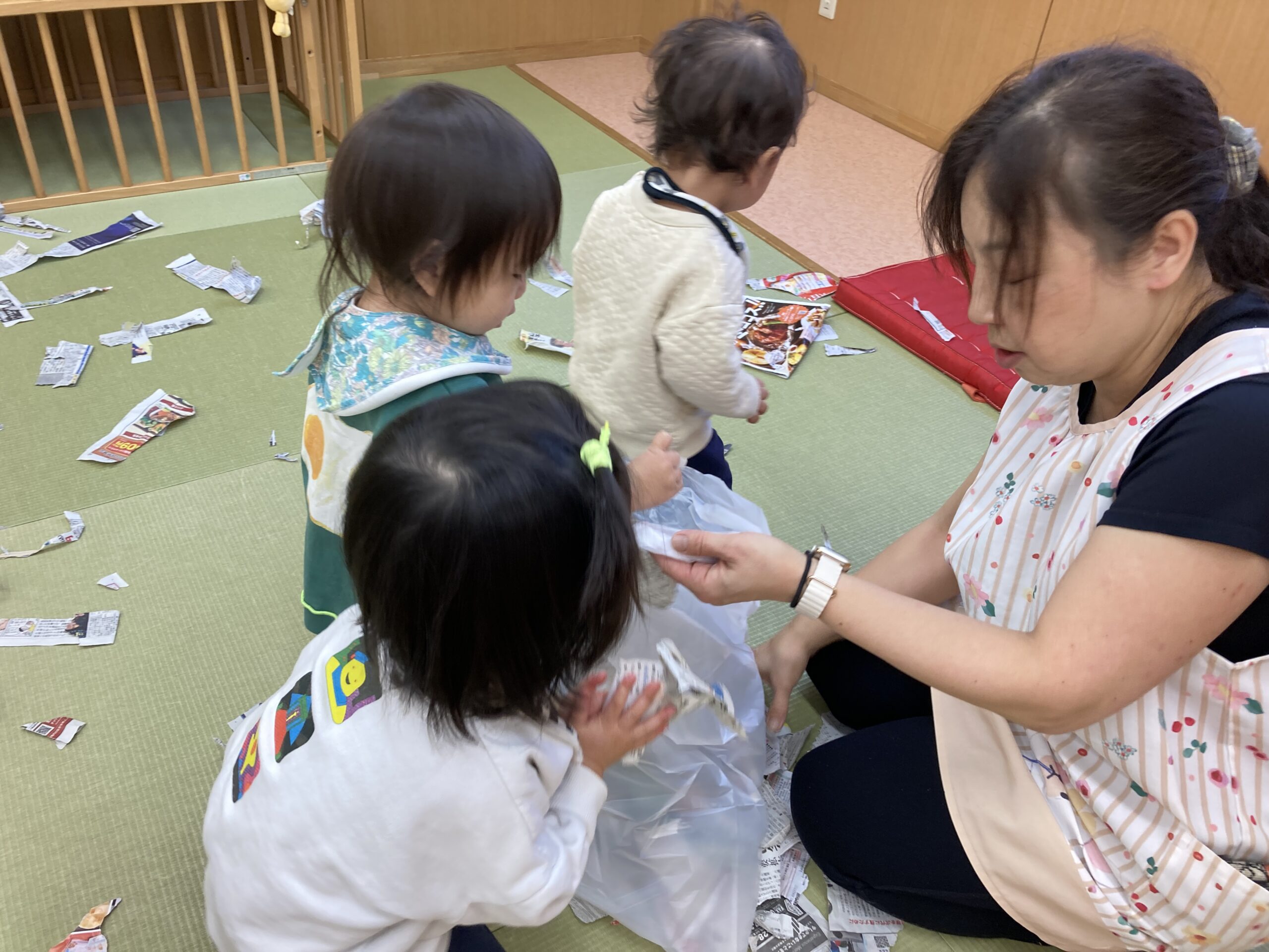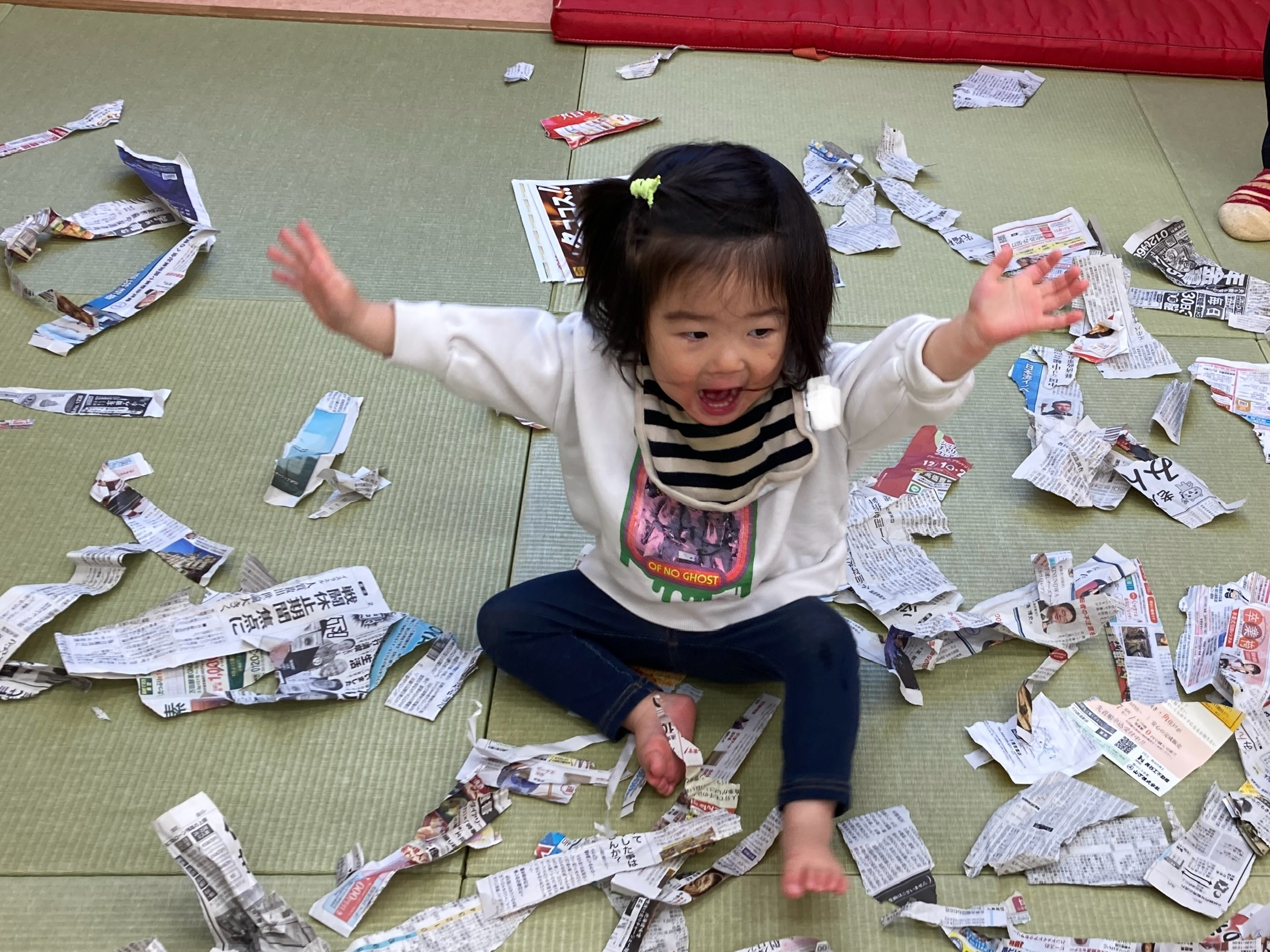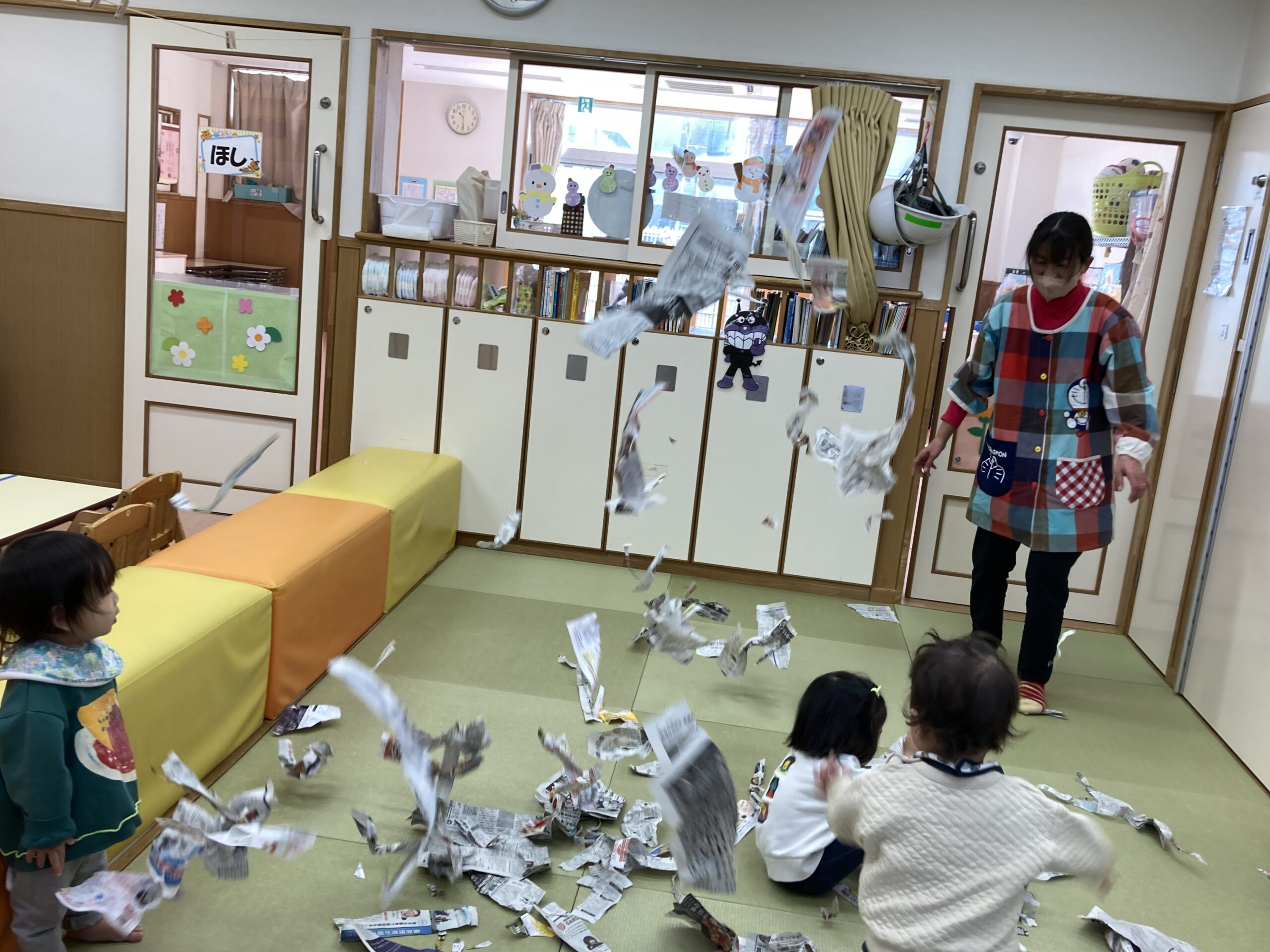 思いきり新聞遊びを楽しむひかり組さん♫