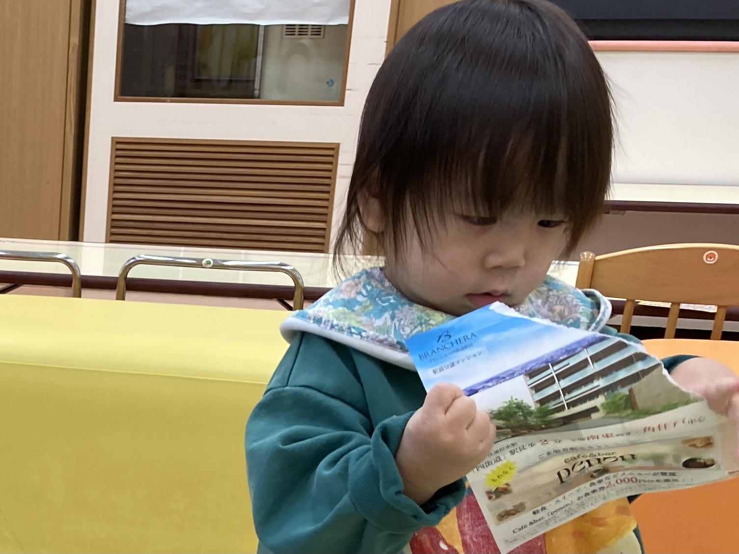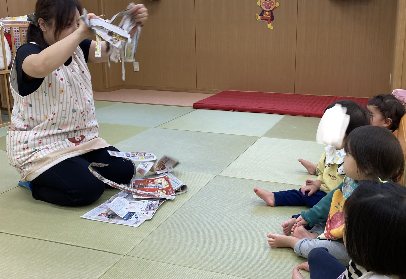 保育士が新聞をビリビリ破り始めると「早く遊びたい!」という気持ちがあふれます。それをグッと堪えて最後までお話を聞いていました。