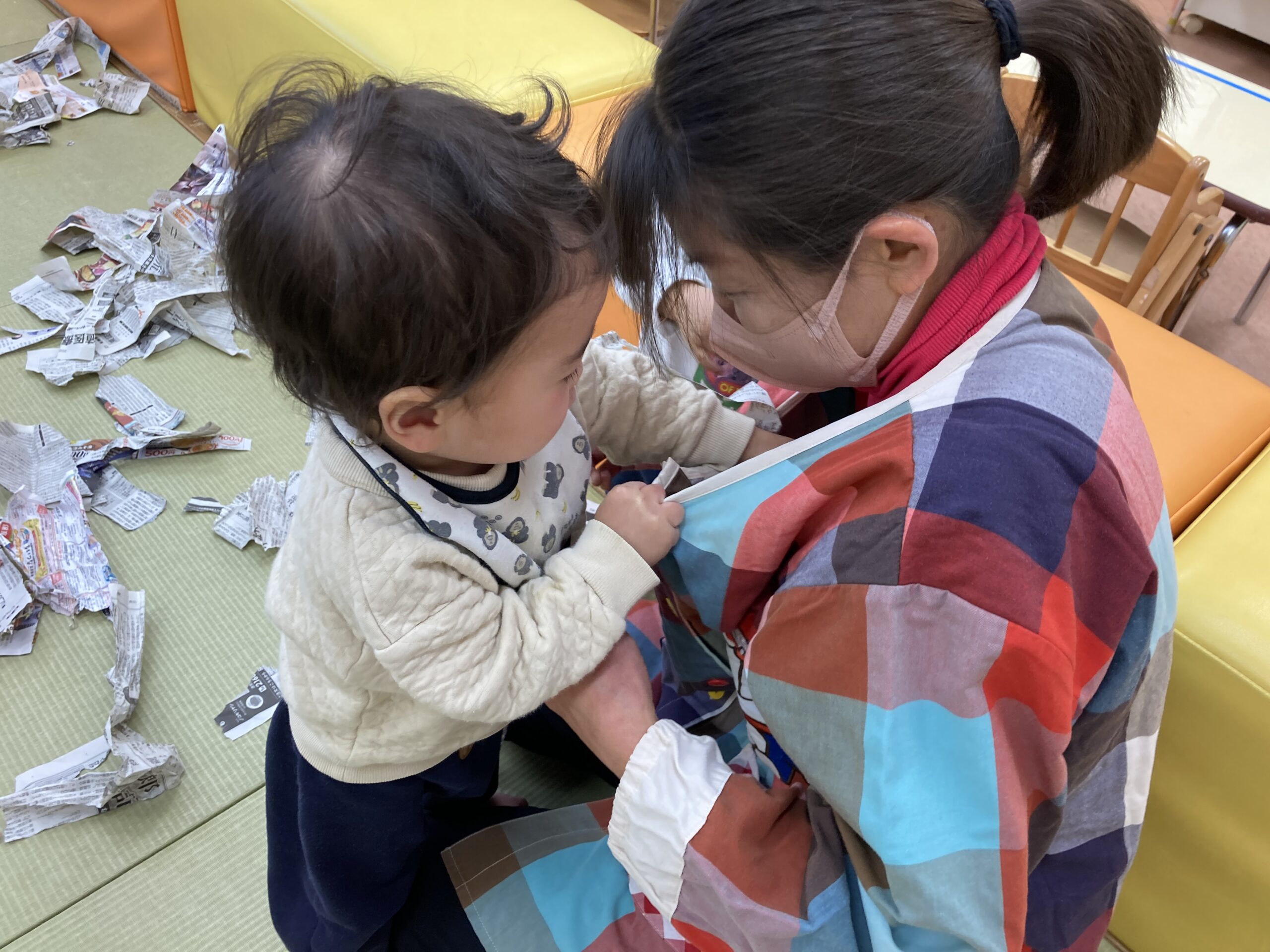 先生のエプロンにいれてみたり‥子どもたちのやってみたいが止まりません。